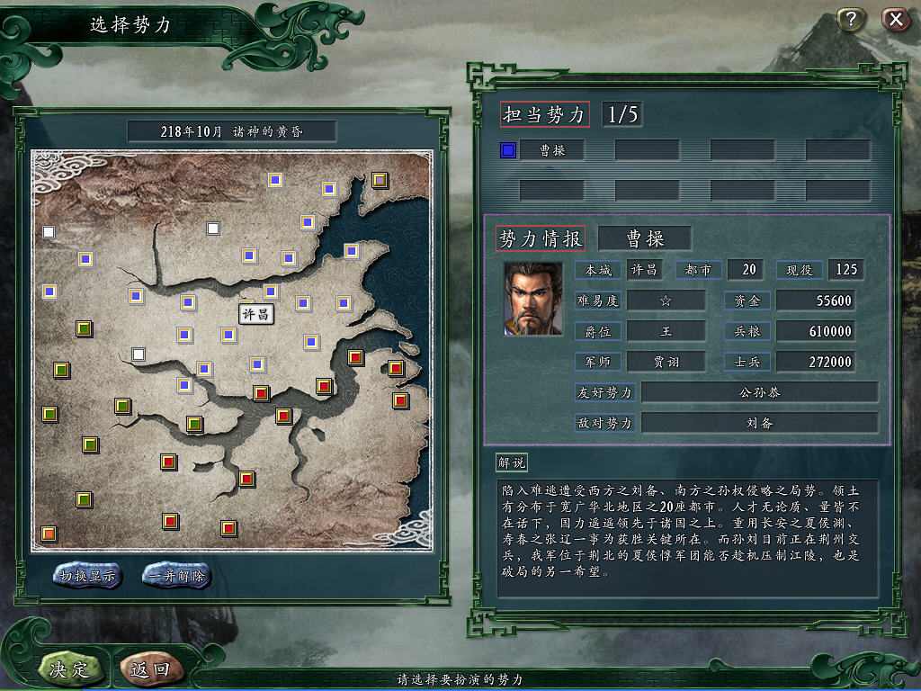 时为218年岁暮,三国志中一批最优秀的英杰们几乎都将在十年之后相继去世,魏国的曹操、张辽、两夏侯,蜀国的关张马黄赵,吴国的甘宁、韩当、周泰、吕蒙……然而一些新的年轻人才也已经开始斩露头角,他们是未来的舞台上的主角──或许这可以算作对于将星们的离逝的一点补偿吧。在本剧本中,一批名将在十年内陆续的去世,可以使大家尽情体会到英雄末路的悲壮和新人才养成的乐趣,同时使一些在之藏匿于英雄的光辉之中的年轻武将得到玩家的重用~~~- -+ 好了,废话不多说了。。。首先了解一下在这个剧本中哪些名将会很快去世: