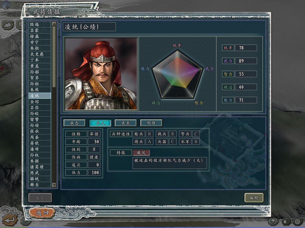 张郃(提升武力,晚成,成为曹魏第一将。特技改为遁走,纪念那次中计后还能突破蜀军重重包围的壮举)