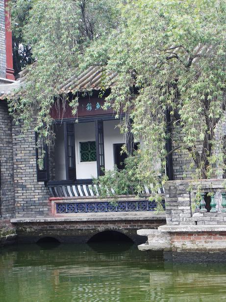 过了壶中天,天井里置了一方施以釉彩的桌子,不晓得是不是原物。可园重修于道光年间,广东开全国风气之先,园内装饰也与内地不同。稍早前去过梅州黄遵宪的人境庐就看见彩色玻璃作窗户装饰,相比之下可园的玻璃用得更加考究,各色镶嵌,错落有致。可园水面面积极大,这是我万没想到的。开阔程度不遑多让拙政。可能因为拙政水面狭长,两岸又亭台栉比,所以虽大但不很显出来。然而抛开拙政,能有可园水面大的苏州园林也再找不出第二家,沧浪亭也是靠着江才显得眼界开阔而称“清流萦绕”。