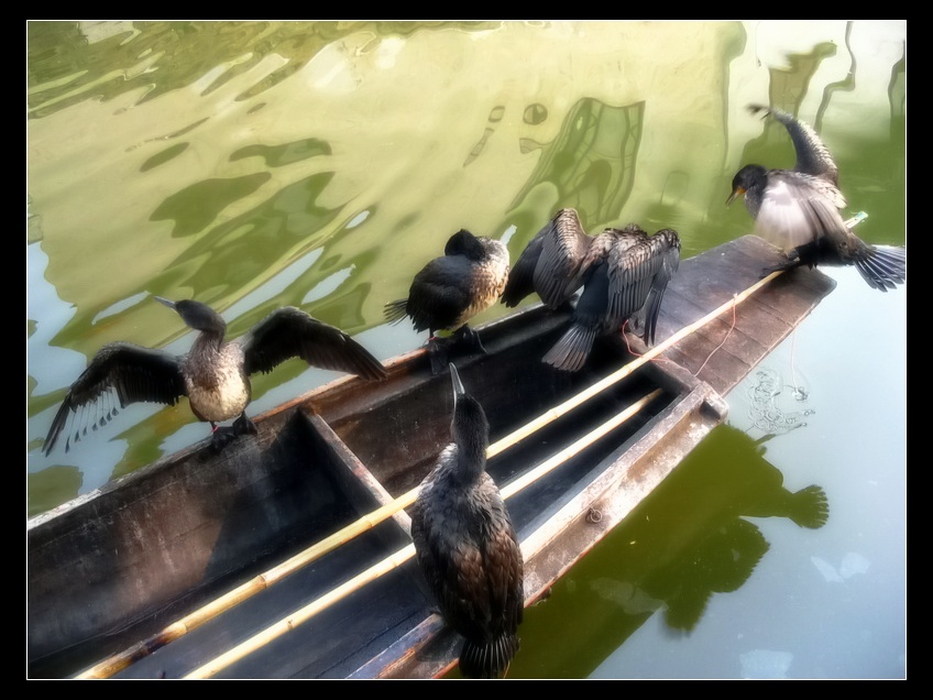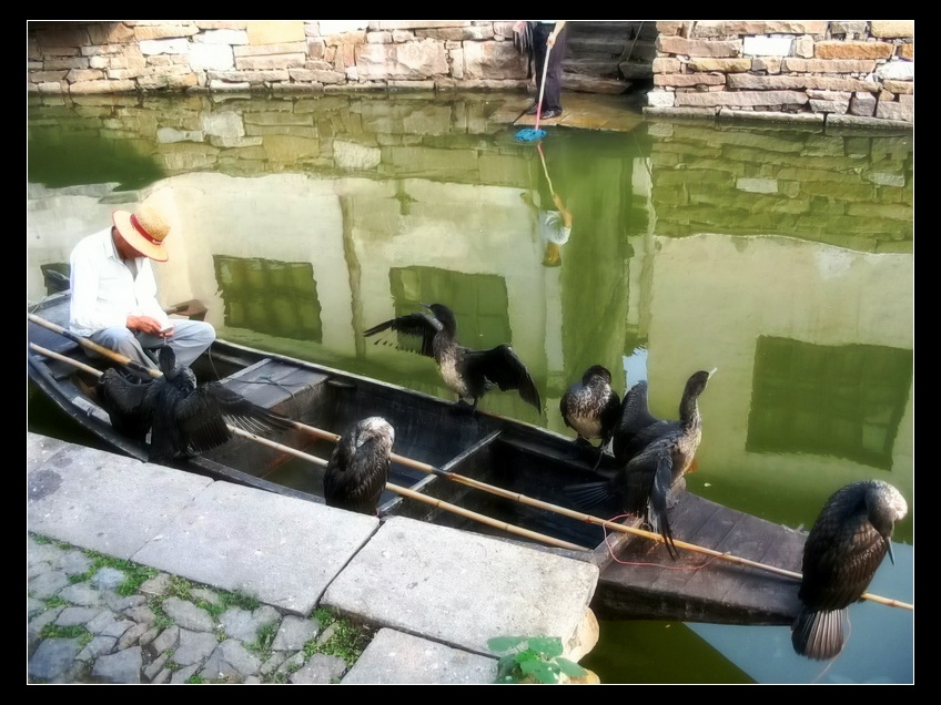 悠然的渔民抽着烟,舟上的鸬鹧拍打着羽翼
