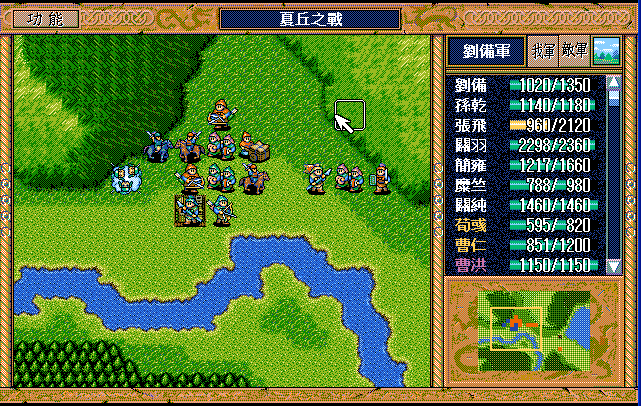 我:刘备奔向鹿砦,糜竺原地激励赵何,糜芳左上焦热书陈宫,关纯原地激励自己,赵何左方牵制武术家(失败),张飞上方牵制(失败)关羽下方牵制(失败),简雍原地援助赵何,孙乾左侧攻击骑兵