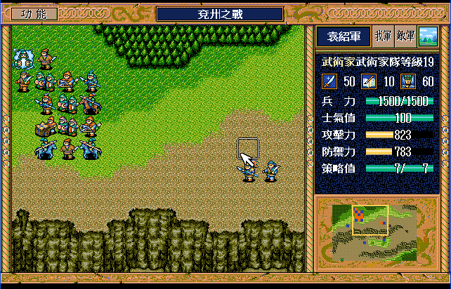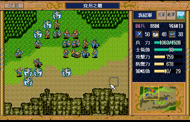 敌:骑兵1右侧攻击(反击)武术家右上(反击)贼兵下方(反击)赵何,军乐队右侧攻击简雍