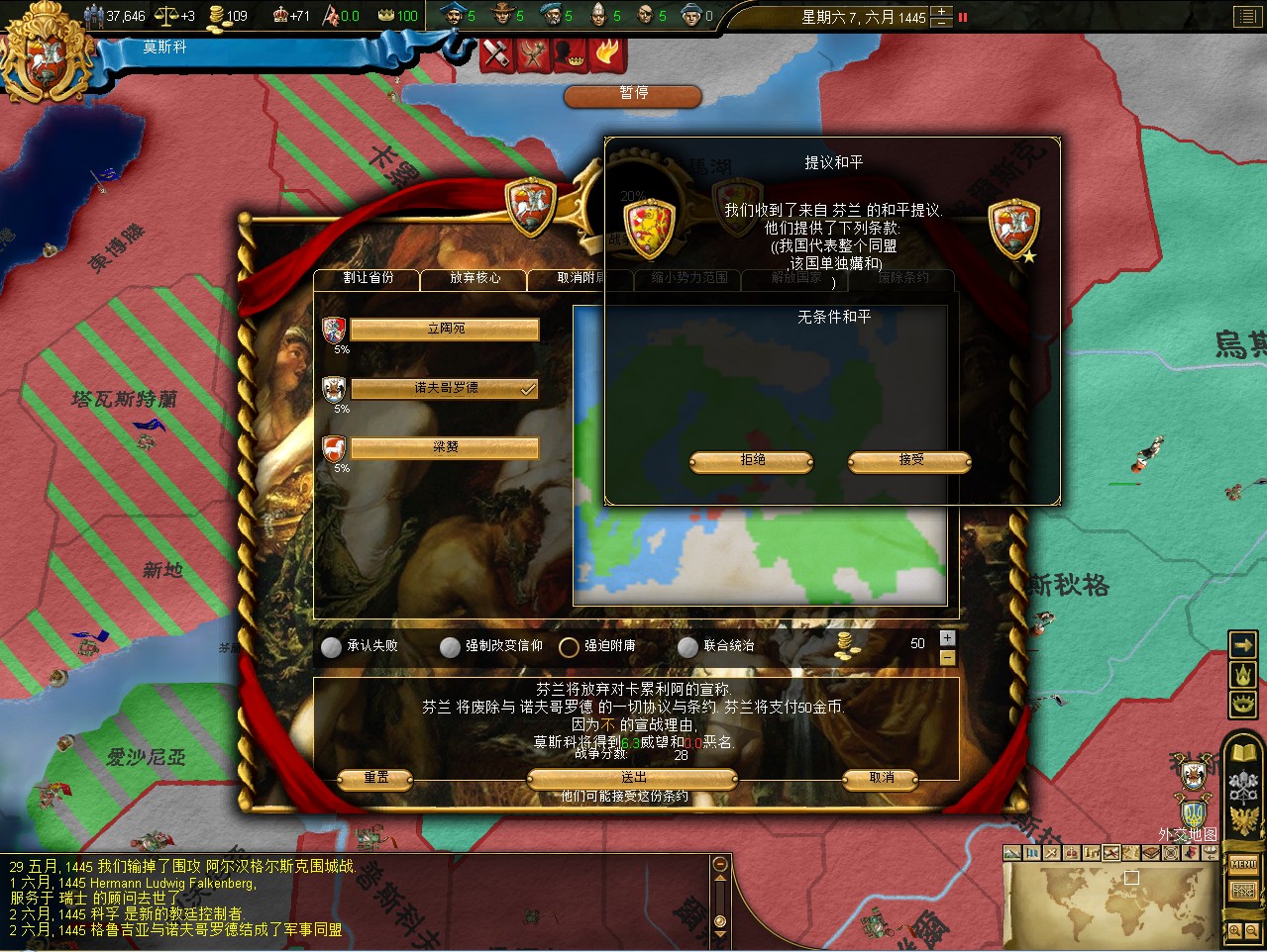 芬兰的地没借口,要了50块,顺便禁止他和小诺联盟,就谈和了。反正成立了俄罗斯以后,可以慢慢收拾它。