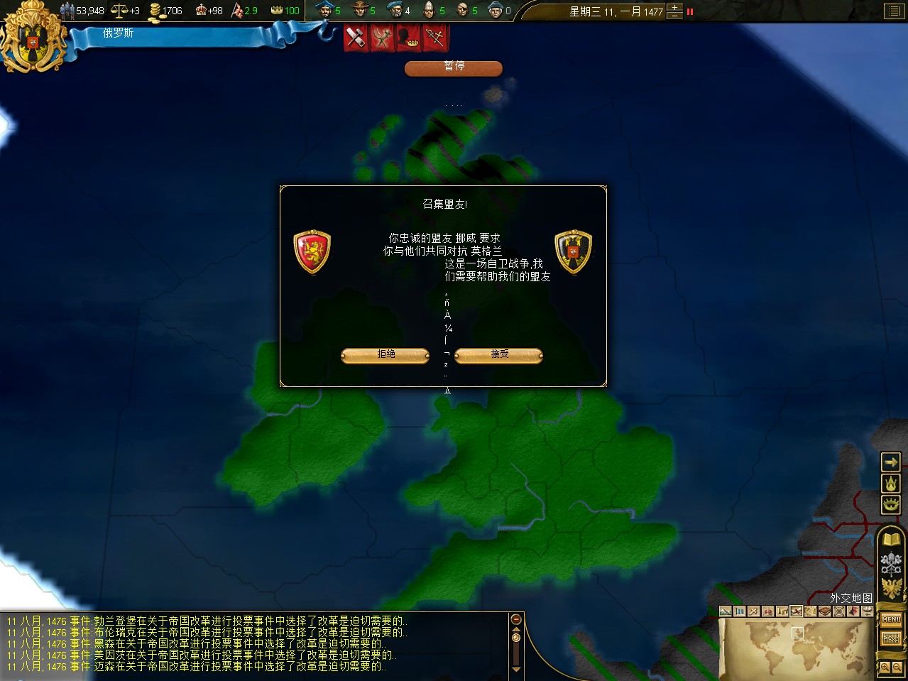 政治科技9级了,能出第二个理念了。我国的间谍不够用,选强化情报组织吧。
