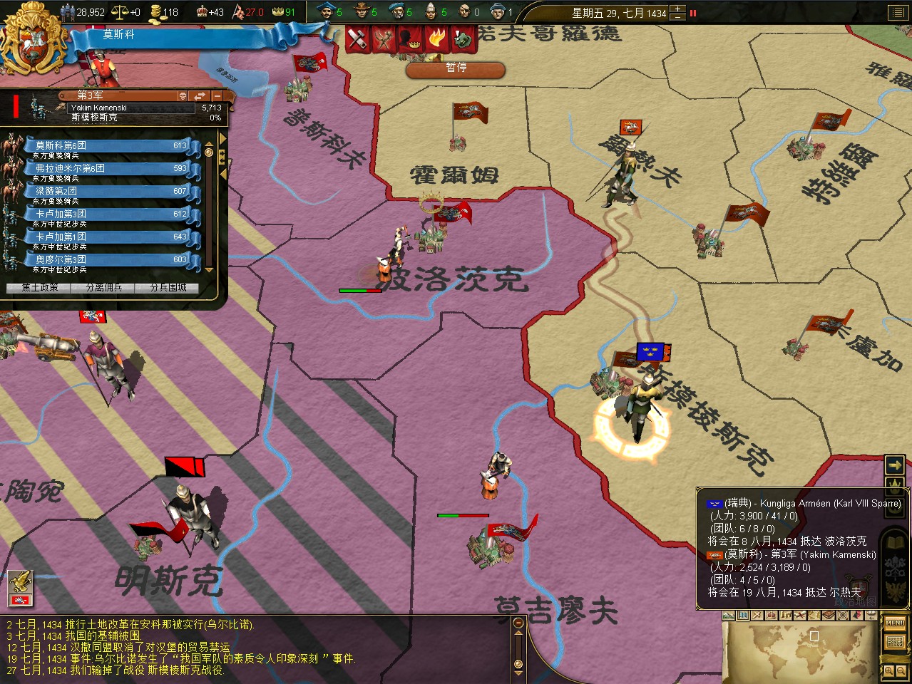 第一军再次被瑞典主力重创,不得已将第三军与第二军一部北调支援北线。瑞典的散兵,还有小卡和不莱梅的远征军在蚕食着我国北方的领土,而南线也与立陶宛的游击队陷入拉锯战中。战局扑朔迷离。不过瑞典主力在追击第一军的时候,孤军深入我国领土。虽然其骁勇善战,又有名将指挥,但现在遭到多方围剿,难以逃出我的掌握了。