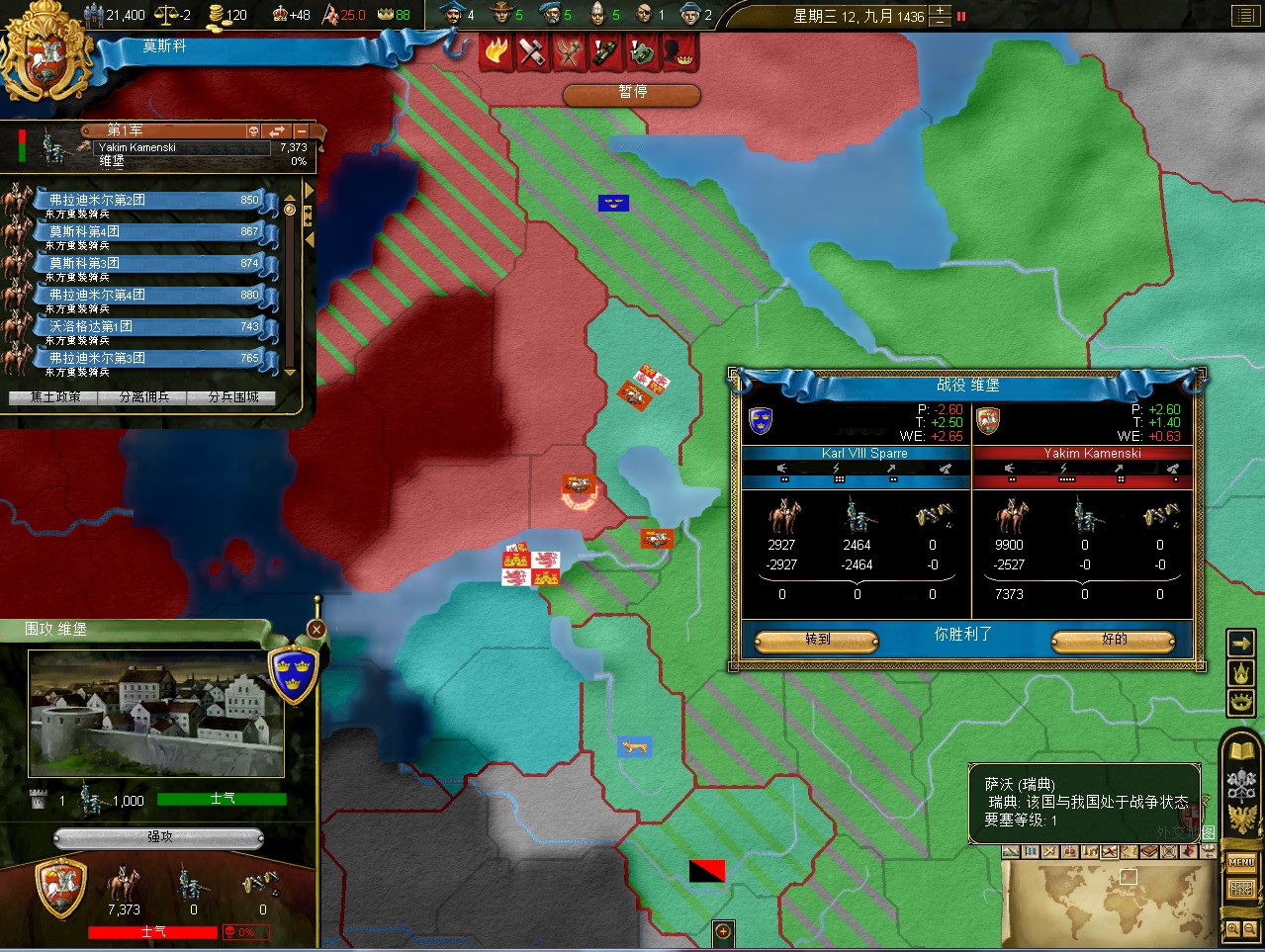 立陶宛广大的领土与大量的游击队让我军陷入了泥沼,国君果断作出决定,与立陶宛谈和,解放了普斯科夫与波洛茨克那些长期以来受到立陶宛压迫的人民。我军集结有生力量,准备全力反攻瑞典。