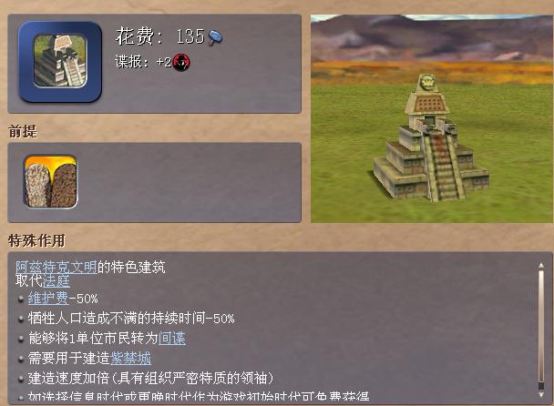 这次改用南美小国阿兹特克,话说不得不吐点槽,除了部分海图型文明外,中国实在很难用,UU要求高,需要14个前置科技,并且还要有铁,而且还难用,想要用好必须形成规模优势或者和投石海配合,话说如果用投石海,那么根本不需要搭配诸葛弩,用钉锤就很王道,还能晋升攻城,为来复枪做准备。而UB呢,除了文化胜利,25%也没什么用,还不如棒子国的大学城