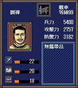 刘禅,武力22,智力20,统率18,西陵第一回合作为41级战车加入。