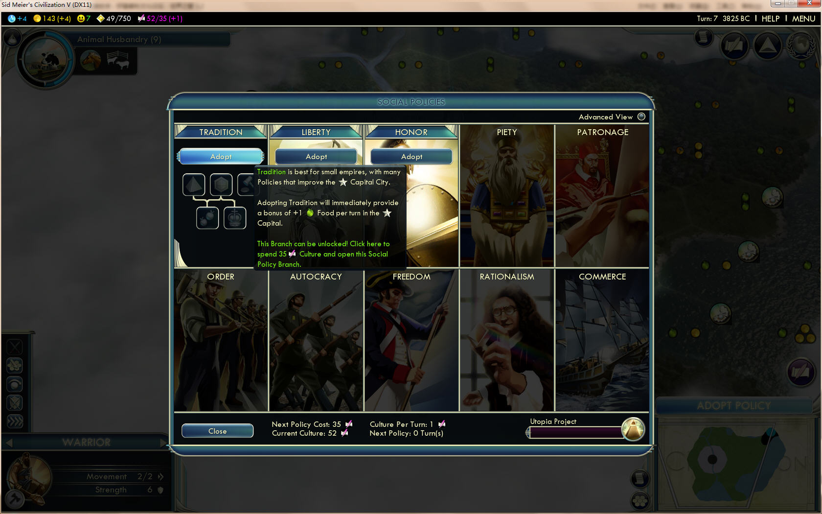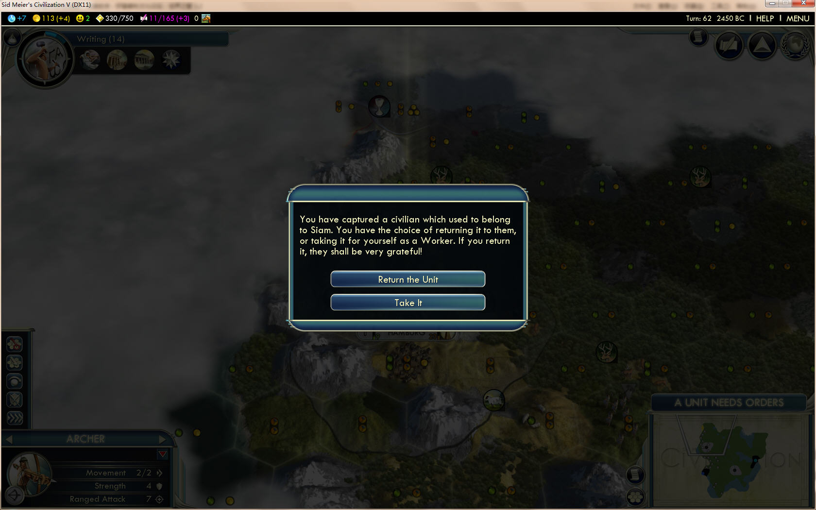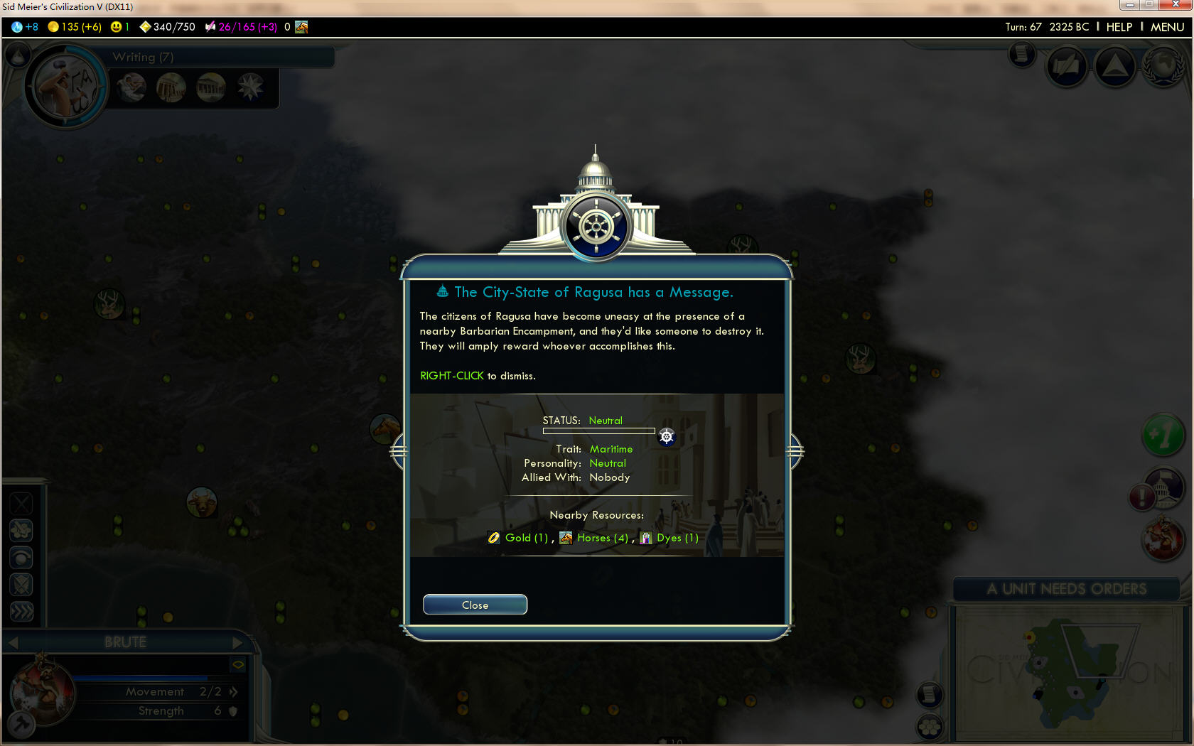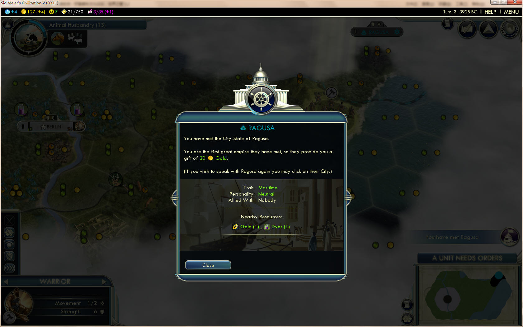 勇士踩了东面的遗迹,得到金币85,然后看到了城邦的国界线,于是过去领了30个金币的第一次发现奖励。拉古萨,航海型文明,中立性格。和航海型城邦搞好关系,他们就会送食物给你的城市,首都更多。难道是卖咸鱼的……