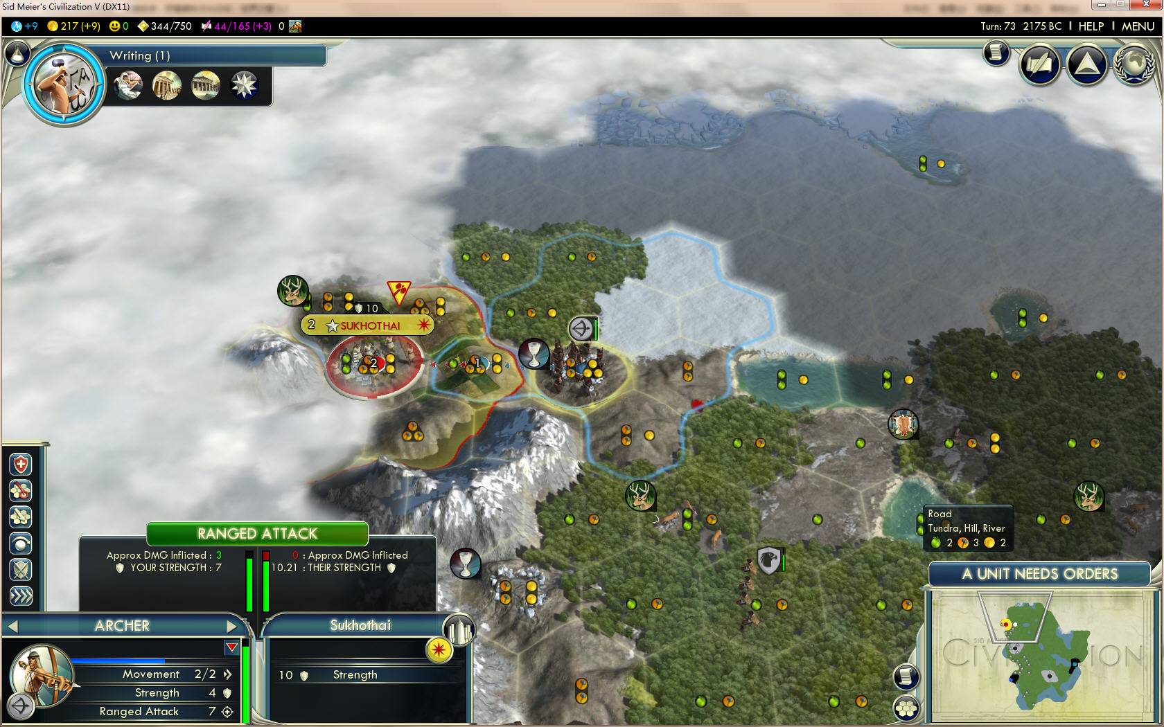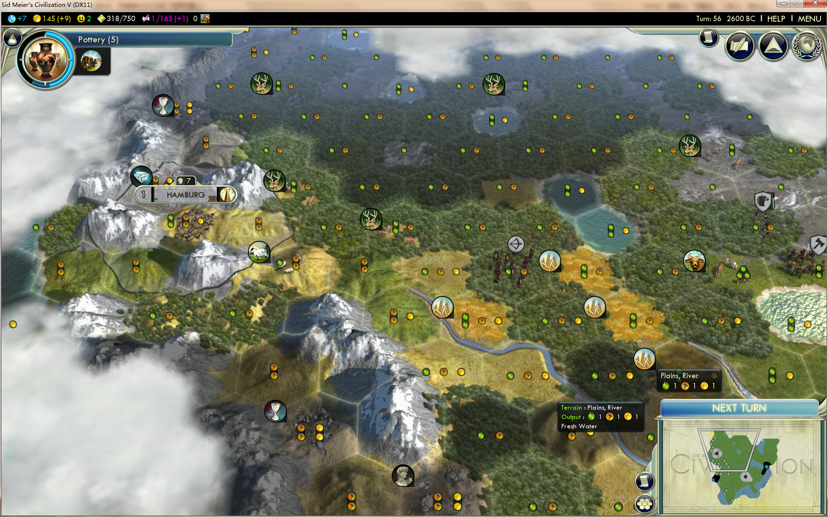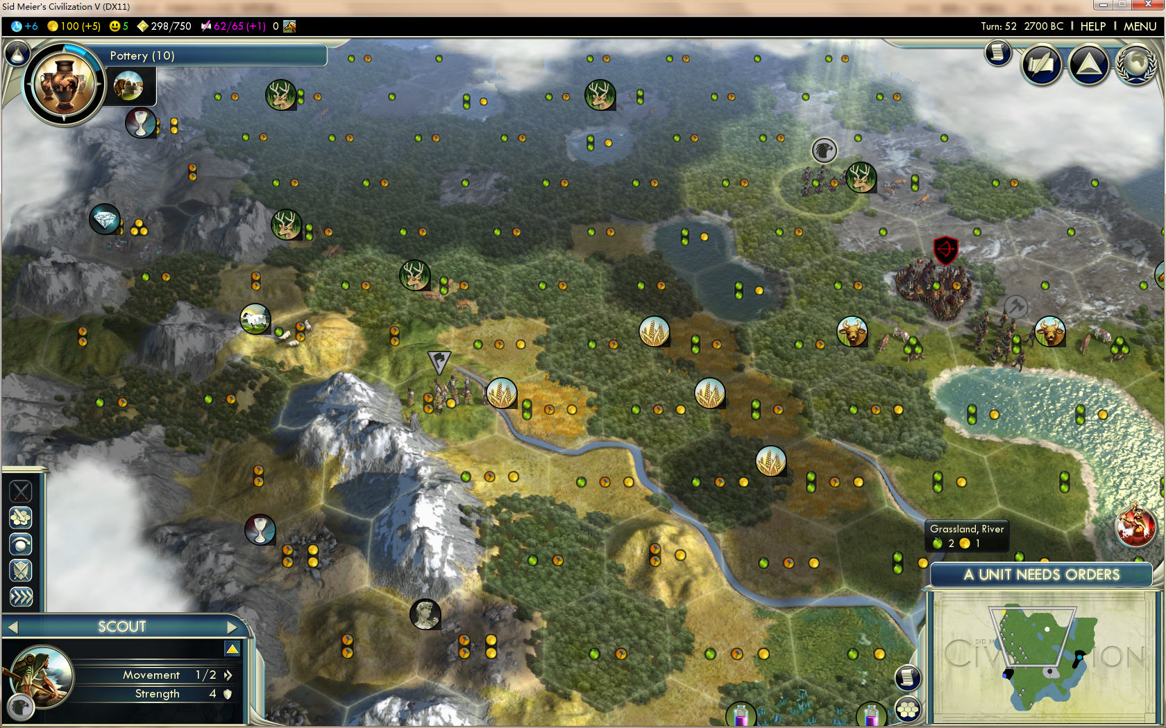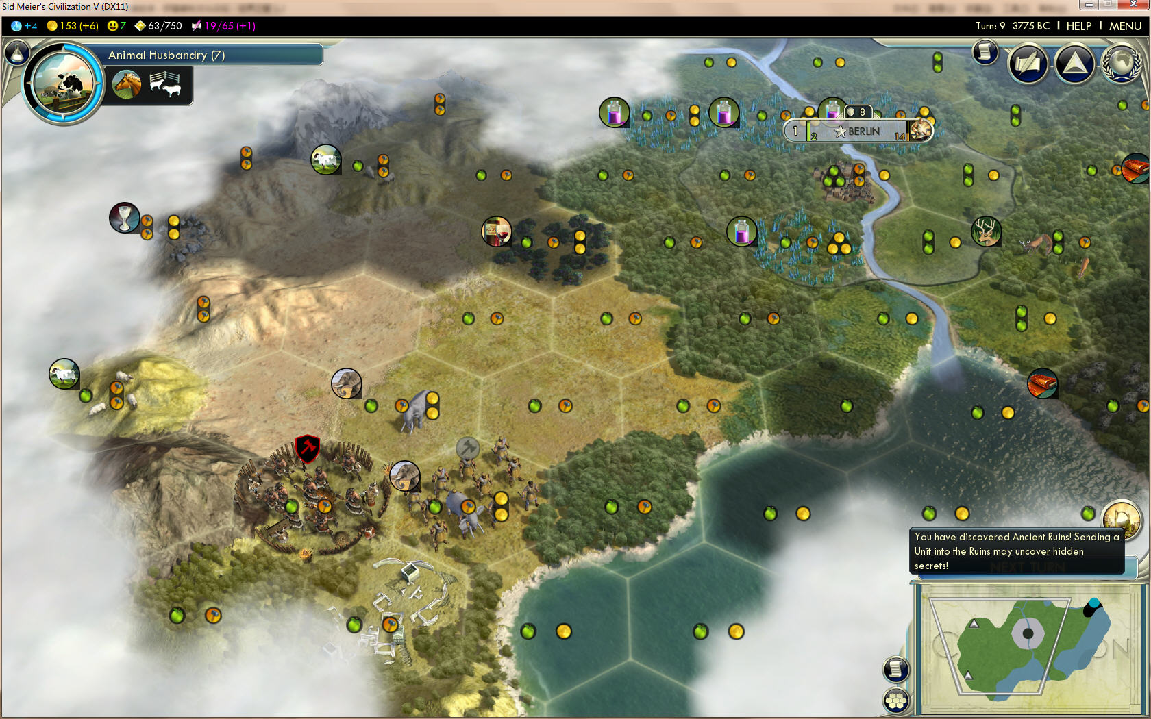 让我们看看相爷的出生点,还是不错的,直接有三个染料,靠河,不远处有鹿,而且东边和东南各有一个远古遗迹。不过锤子少,出工人就会慢了……于是先让勇士去踩遗迹了。
