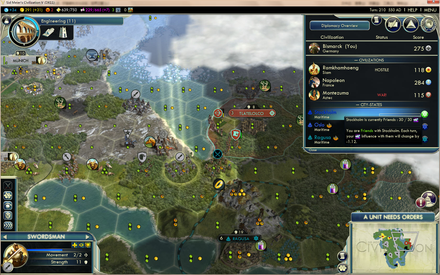 法兰克福买了葡萄地,修成酒庄后加了5快乐。1000块买了拉古萨的同盟关系,没有帮着出兵,但是给的食物和资源也很给力了。