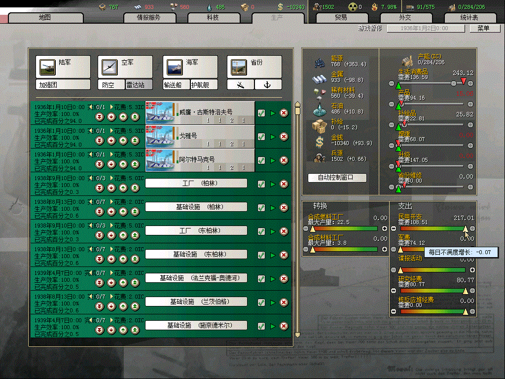 36.01.01现在蓝色区域修基建吧,每个工厂要10人力,实在太高了,等出了人力丰富国家事件以后再修,经过粗略计算,在IC大于4的地方修基建比修工厂的收益高,部队全都分散,后勤专家带队去重工业城市压游击