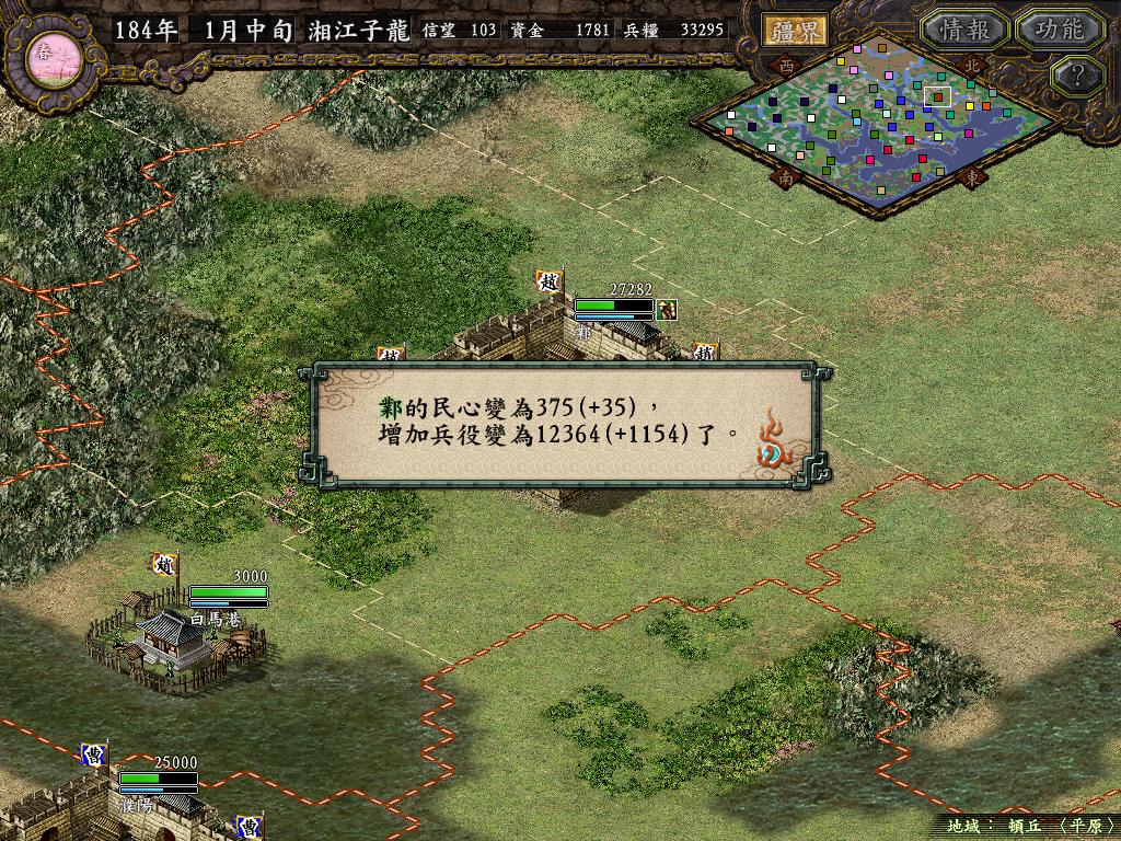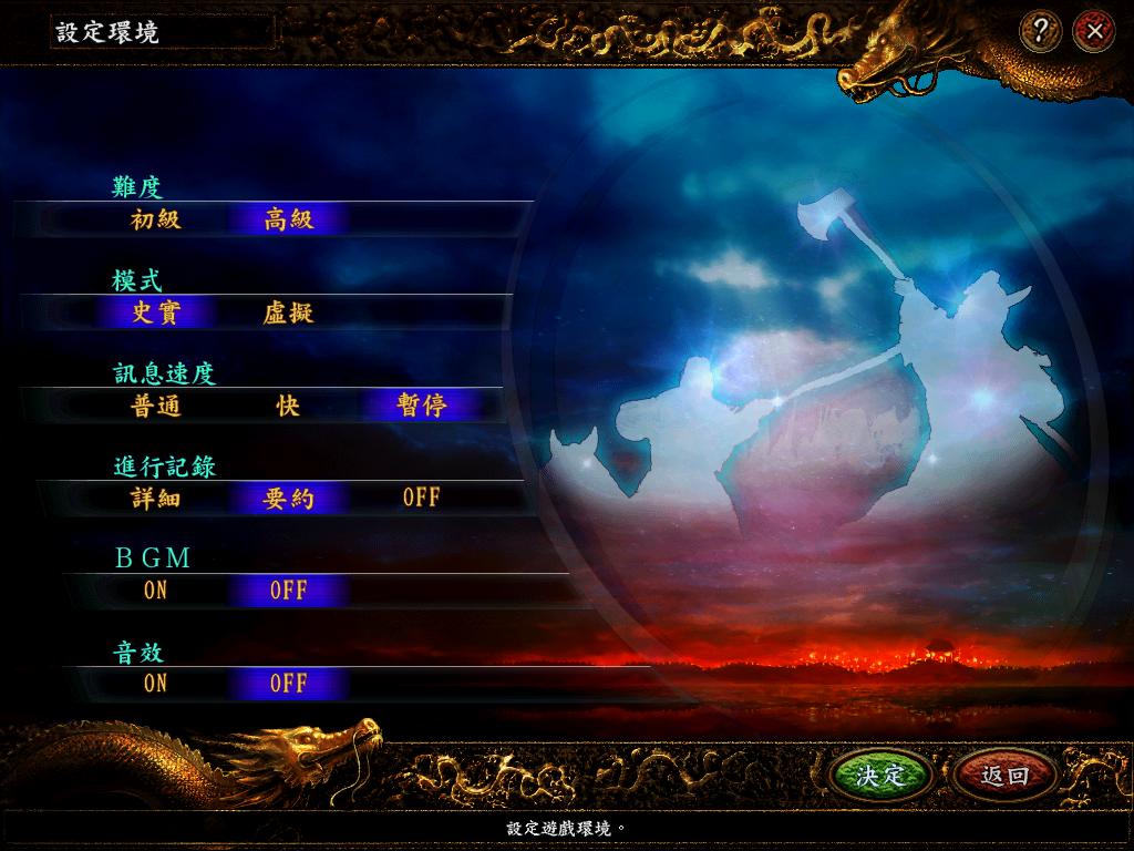 还得说句题外话,游戏开始了,游戏设置还是要选择一下的,难度?当然是高级了!史实不史实的也没啥意义,反正都穿越了。为了截图方便,讯息调成暂停。背景音乐?您饶了我吧,我听见那恶心的声音就有种便秘的感觉。