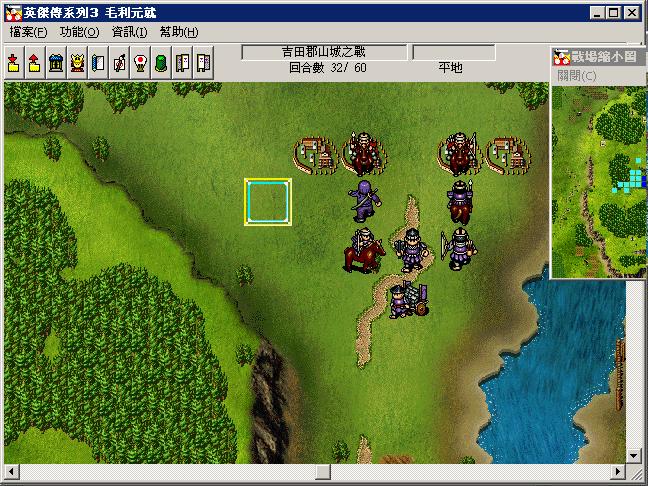 2:开局其他人向下,6回合的时候到达山口.第7回合,第8回合,继续向下,其中世鬼要连用两次快步,堵住敌军向城内进军的路线.到16回合左右第一批敌军全部消灭,并引出左上的敌援军.然后福原独自向左上行走对付敌援军(重要,如福原把他们引下来,暂时经验会多些,但是运输道具的路线会被堵塞,恢复酒会不够,也不能保证福原能攻击到最后一回合),其他人进军中间的小岛,岛上上方鹿砦的弓兵留着,让口羽反击到结束.剩余的人直奔敌主营.