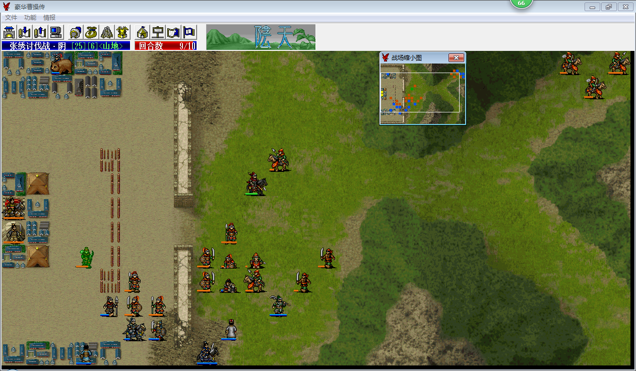 第七回合的时候,小夏侯刚好出双击打掉曹洪前面的骑兵(不双击的话曹洪上一回合打一下这个骑兵也行,我第六回合曹洪选择了打弓骑),为曹洪突破防线去城里拿物品打开了缺口,从进程上来看这个回合走刚刚好,而乐进已经无从选择了,只能加移动一路前行,而且途中不能遇到ZOC的阻挡,所以徐晃也必须加移动进城为乐进掩护,而且移动从距离上来看,徐晃加移动后进城堵路消耗的移动刚刚好,就需要两个强行了,而带遁甲的李典和曹操刚好可以满足这个条件,这些都是我事先没有考虑算计过的,只是大概第六回合的时候我就感觉必须让徐晃往城里靠了,所以楼主才说最后成功全灭是绝地大逆转。第八回合开始基本就没有什么好说的了,上路主要靠小夏侯的反击打出伤害,大夏侯和曹仁主要还是打骑兵,最后剩余1行动力惊险过关。