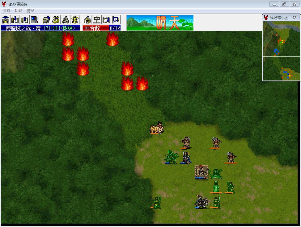 战场战术上要仔细说不容易,这一关地形狭窄,非常考验走位能力。还是一如既往一路原地防守反击,一路快速突破踏营,我对于这种战术套路几乎都已经有疲劳感了。曹操传MOD战场的传统一向是敌军“哈哈,你这回终于/ 又中计了吧”,然后被我们一顿胖揍,反客为主对于玩家来说是家常便饭。我也不知道是不是冰淇淋把猪哥的智商降低到吴用的水平,博望坡这一关我军完完全全是客场作战,却给了主场的待遇,恰到好处的火墙,在骑兵地形迎战大股的山林部队,说真的,伏兵的两侧不安排几个弓箭手我还真觉得不科学不习惯,可能是我玩的上一个MOD是瓦岗的原因吧,记得有一个关卡真的被峡谷两边的箭楼和间谍射怕了。
