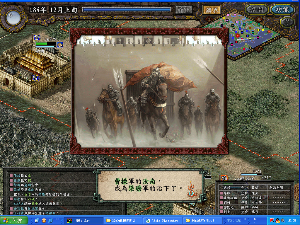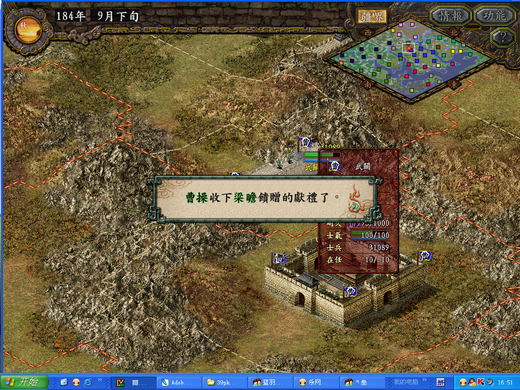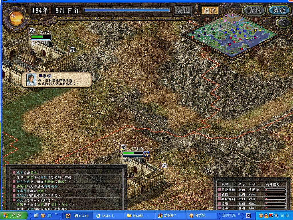 接下来的几个月是艰难的日子,太久没玩忘记了做投机倒把生意的我陷入零花钱不够用的困局,只好天天把手下派出去刮地皮打秋风和干些小偷小摸的勾当,然后,守汉中的大将是之前被我发现后耍大牌不肯归顺的版猪,配合着预言如段誉的六脉神剑般的黄军师将我郁闷得想撞墙.