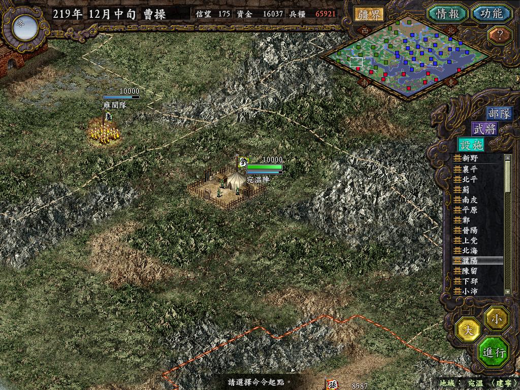 武运昌隆!自草鞋小儿自立汉中王来更贪得无厌,直接称帝,随即吴魏相继称帝.LM高唱"五虎在手,天下我有!"GB海盗日益猖獗.扬言:"港!都是吴国滴!"魏主面对两家嚣张的气焰,不为所动,任尹大目为丞相,曹熊为伐吴大将军.第一天就下达命令,该巡查的巡查,该征兵的征兵,亲自坐镇许昌督战,由于河北军房规,魏主不再像过去主攻了,现在的重要战略目标是要孙刘在武陵和江陵开战,而自己一方面不要在前线太多兵力,以防给两家造成压力.