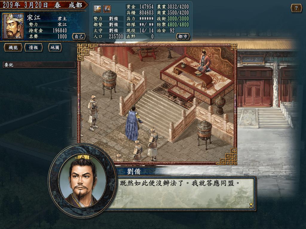 背景选为207年的剧本,操纵人物为宋江,宋江等108将皆于长沙在野,彼此之间亲密度都是100(但宋江又都不相识,除了对扈三娘和宋清),宋江有私兵10000,同时也有几个头领也是有私兵的,就看玩家怎么举旗兴兵,与天下争衡了!108将流失的速度也很快,先占长沙还是先聚齐108将,由您自己决断!