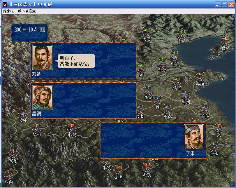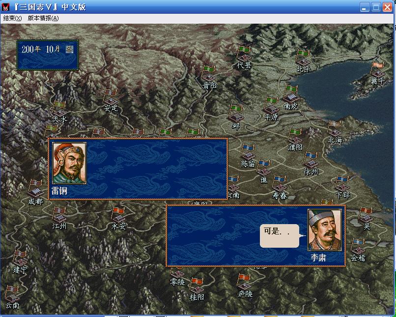 本来是在百度的“三国志5”吧里瞎转,发现有个置顶帖说应有刘备继刘璋国土剧情,但没人发过。刚好我有次打出了刘焉剧情,因为觉得新奇(其实已经好长时间了,MS也算不上新且奇了),就保留了存档,这次抓了全部过程的20个图,准备发过去。可到了那边才发现,那里好象只能引用网上的链接,而不能发电脑里的图片。本来这些图应该发在“三国友盟论坛”的(毕竟在那边混的时间长,而在这边注册还是一年前为了找岳飞传),但友盟挂了,只好借用贵宝地,失礼之处,还望海涵