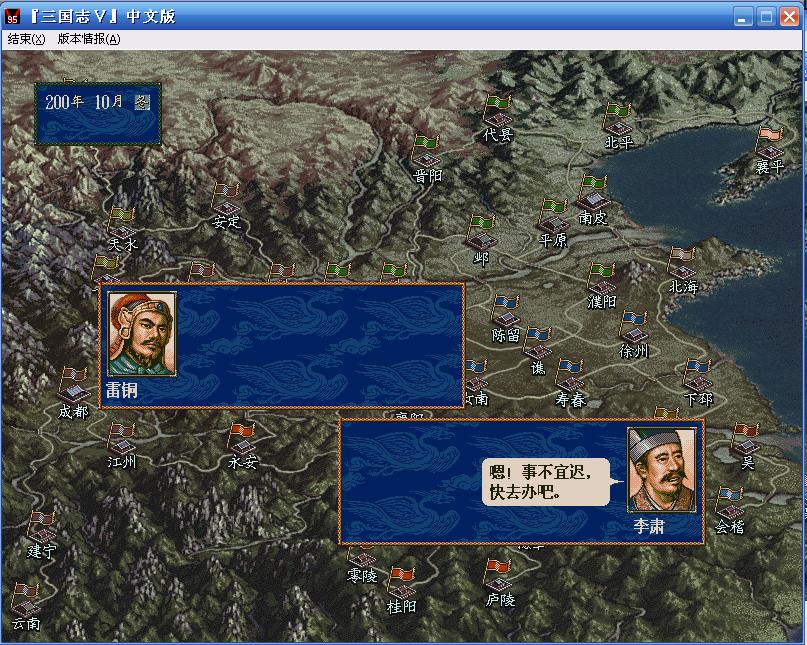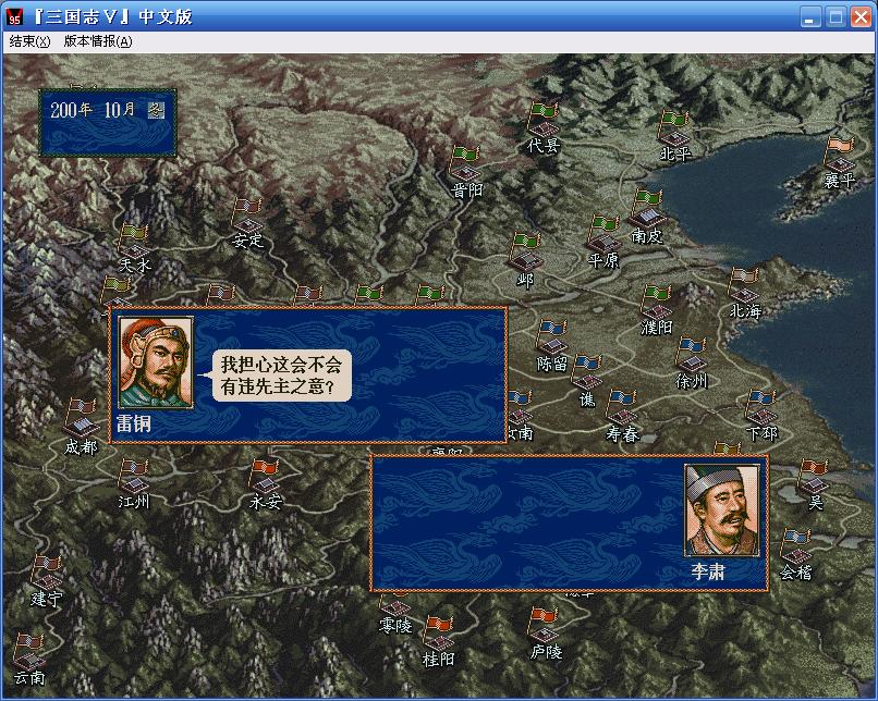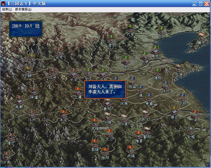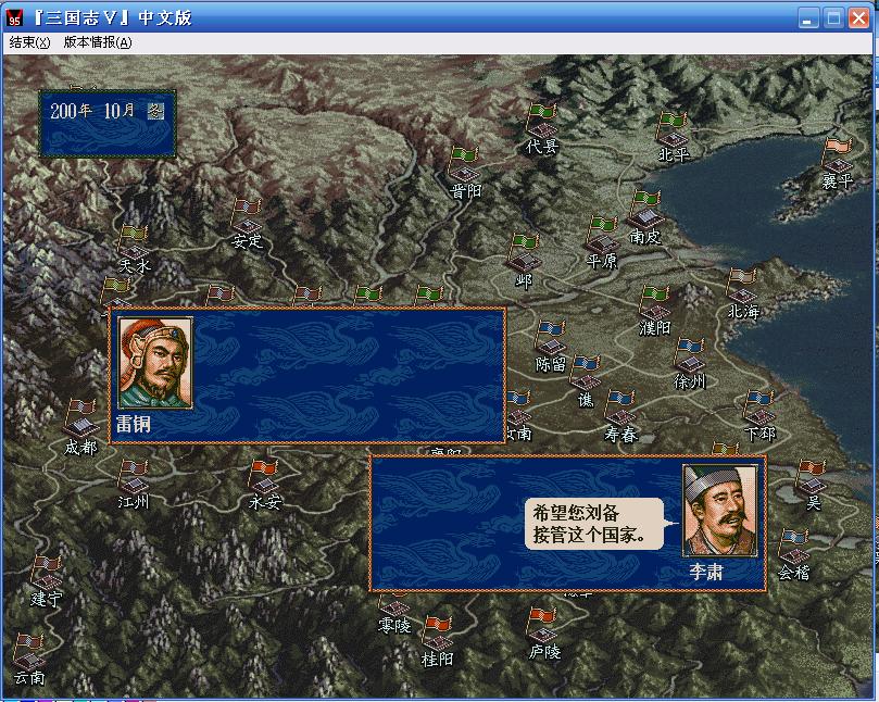 三国志五完美硬盘版(解压后220M,音乐都全,在WINDOWS下运行的)我选的是第二个年代:火烧洛阳。难度:高。史实模式。君主:刘备
