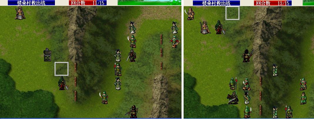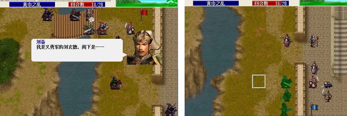 第一回合: 刘备走到村庄下面霸气,张飞斜角对穿双击严政(这里可以S/L,不过我运气好第一次张飞就双击且严政军团全灭). 友军回合S/L出关羽击退波才连同2个剑兵的撤退,上路2枪兵将管亥打喘气。第二回合 张飞左移进村暴击对穿枪兵张曼成,左移到张曼成左边3格烈火(可能打不中),下面村子援救成功。友军回合 智障村长回归张飞,无脑武圣上山砍枪兵,上方2个枪兵击退管亥。敌军回合关羽反击击退高升,枪兵反击程远志后程远志还有100左右血。第三回合张飞气合,友军阶段枪兵击破程远志三个村庄全部解救成功。第4回合张飞刘备分开 不然村长又要做出智障行为了,张飞咒骂邓茂;刘备移动到村长将要移动位置的左边2格卡位 避免村长被多人攻击(不过过来那个小兵还要期望他不要暴击 双击村长)。第5回合张飞击破邓茂,刘备原地补给村长。第6回合 刘备 张飞主动对话关羽,关羽张梁左下一格将其击破。第7回合,关羽冲锋暴击张宝(6回合才存档 很好S/L),张飞向上最大移动,刘备吃的卢蹬。 8-10回合赶路,这几个回合刘 关 张3人的血尽量补满,我在这个回合的时候刘备MP用光中途吃了个仙酒。11回合关羽走到如图位置待命,可在第13个回合挂掉没觉醒的张角,仍然是S。 我选择的是全灭敌军过关,关羽走到如图位置吃猛虎丸。