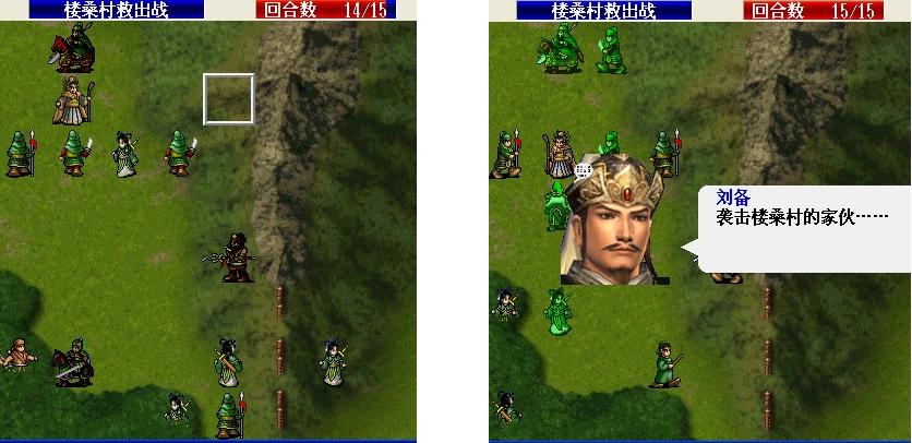 第4回合最大移动后山岚,友军移动后张飞主动对话刘备。第5回合刘备下移,如果第3回合霸气,有较高几率躲过小兵的攻击。第6回合,平移烈火过关。只触发了一个对话,评价B。