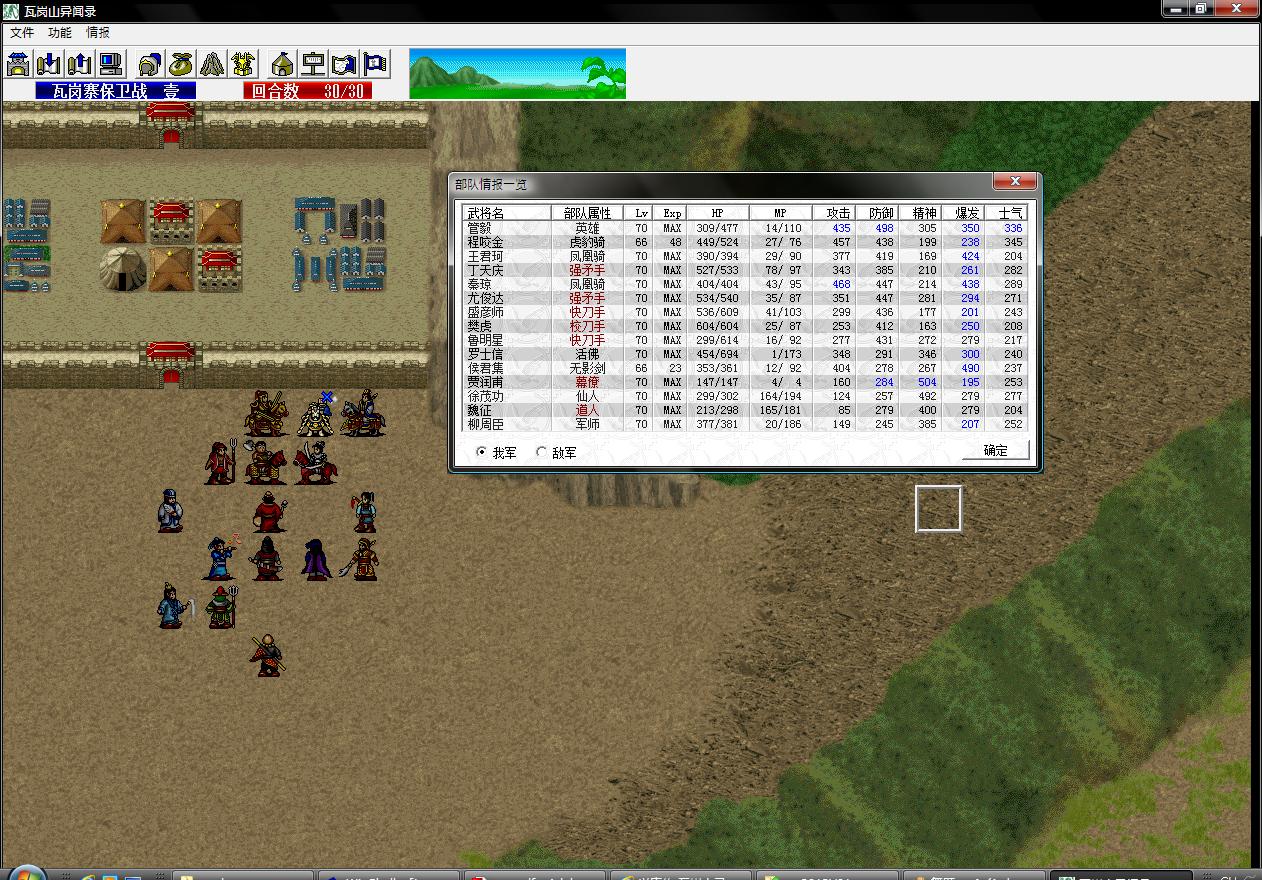 用的是降难度的打法,第三个回合直接出动伏兵,否则时间来不及。除了贾润甫和3个步兵,其他人都是到了最后一回合才升到70的。少了个管毅的战备,经验调配起来非常困难,只能靠傻子不停给别人战备,他自己带着金鈚令最后关头才追上来。