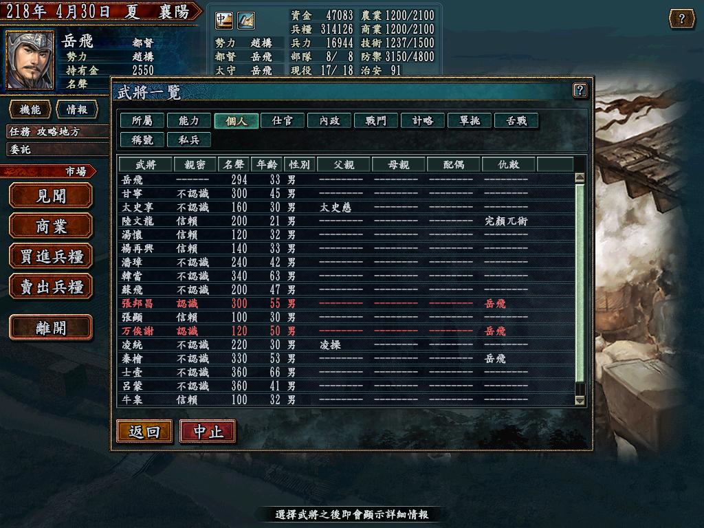 下面借用毛的“说岳剧本”,因为这个剧本里一开始岳飞就是都督还只有一个城市,而且岳飞手下是没有一个军师的,有军师的需求,和我需要的条件刚好混合。