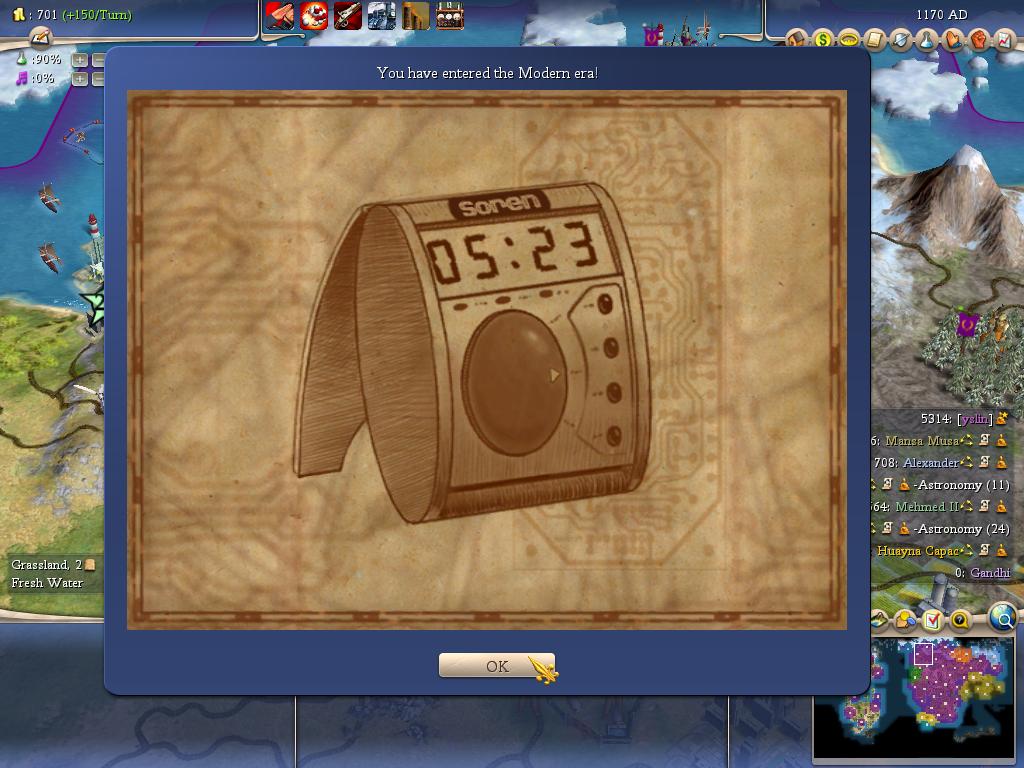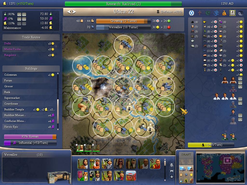 本来想把希腊人收了,可惜亚历山大骨头还挺硬,不肯投降。新打下的一些城厌战情绪极高,有的地方已经有8个不满了,现在杀人不太划算,就此收兵吧,都开发新大陆去。