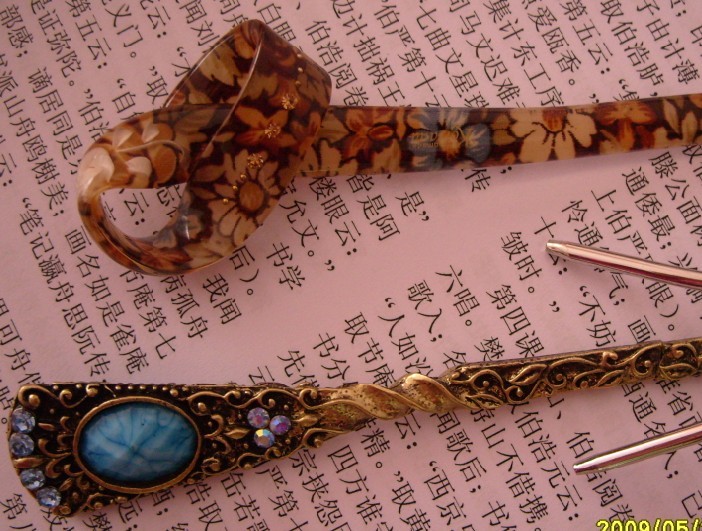 呃……那啥,已经夏天了,天气越来越热,长发的MM们是否跟我一样,喜欢把头发挽起来,让脖子更清爽些呢?昨天一个好友问我怎么盘发,以及怎么选择簪子,额就只会额自创滴最简单的一种,配图发来跟论坛里滴长发MM们交流下,没有用过这个法子的MM们可以试试看,会其他挽法的MM们更欢迎交流指导撒 那就开始吧:) 先来说说簪子的选择好了。我有四支簪子,一般常用的就是一两支,其他都是备用的。 这四支里头(见图),有两支是韩国树脂材质的(咖啡色和蓝色花底的),这种簪子市面上有很多仿货,要看仔细了再买,仿货就是塑料的了,不等用就断。一支是生铁的(古铜色大头镶蓝的那支),另外一支是铁的(镀银双股攒花的那支)。从材质来说,树脂是最坚固耐用的,不容易折断,铁的也好,可生铁的就不行,看似结实,实际最容易坏。我那支生铁的簪子,用了不过三个多小时就报销掉了,其实我很仔细小心的。幸好只有十五块,不算心疼 所以建议MM们挑选簪子的时候,千万不要看外表结实,生铁的最好不要买。 然后就来说说怎么用这些簪子把头发挽起来吧:) 挽的时候,可以用一根簪子(见图),也可以用两根(见图)。把头发梳成要扎马尾辫的样子,用手握住,但是不要扎起来。一手握住头发,另一手将头发不断反拧,一边拧一边一圈一圈地盘绕,盘绕时要尽量紧一些,当然如果喜欢松一点的风格,也可(见图)。只是固定时难度比较大。头发盘尽后摁紧,另一手将发梢掖进发髻里,然后用长弯簪自左向右插过去。插的时候,一面要注意不要用力过大,以防簪子断开,另一面要注意插实,簪子穿过发髻到右边后(一般左边只留簪头装饰即可),不要松手,在右边的头发里,用簪子挑起一绺梳得比较紧实的,将簪子别进去穿过来,这样就比较固定,不容易散了,然后按自己的喜好从右向左插进双股簪即可。(见图)这种挽法,熟练之后,是不需要任何其他发卡来帮助固定的,一般是不会散的:)图中左边向右插的,是咖啡色树脂的弯簪,主要起固定作用;右边向左插的,是攒花双股簪,主要起装饰作用。双股攒花簪对固定发髻也有用,但不是主要的作用,只是二次固定的作用。,主要还是第一根簪子要插牢,然后拿这根对插过去,手如果有数,插得合适,就会使已经盘好的发髻更牢固。