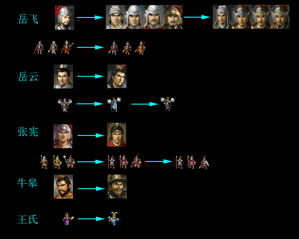 出场人物,王贵、张显、汤怀、施全、吉青(牛皋在前一关已经出场过)的头像和形象在制作过程中都有所改变。头像的演变见附件。形象方面,王贵、张显、汤怀最初使用的是曹操传的普通骑兵、步兵、弓兵形象,在岳飞线发布前换成了drinksun制作的符合书中描述的特殊形象。