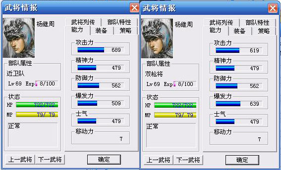 用了雷线井底的一个存档两个兵种都看了一下,发现69级杨继周转骑兵是加70攻,差不多每一级加1点攻,转双枪是加130点爆发力,一级是差不多2点爆发力,也就是把以前当骑兵时落下的爆发力给补回来,成为一个合格的双枪将,但作为骑兵由于平空多加了70点攻击力,应该算是超级骑兵。