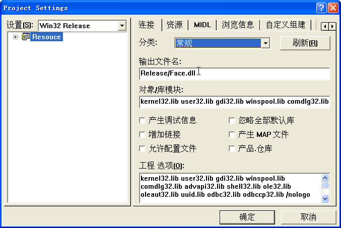6.在Visual C++里面的工程-设置文件的连接选项卡里面,把Face.dll改成Tou.dll。