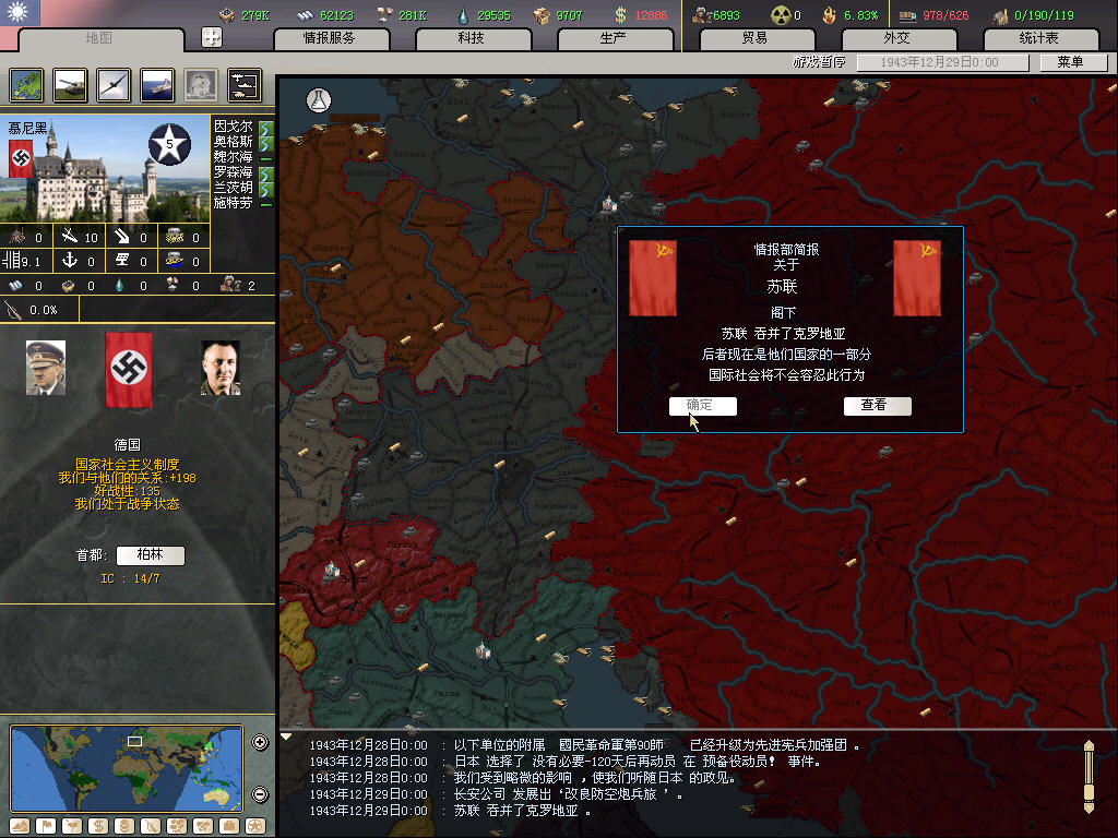 本来搞了7年的经济建设,准备在50年春天把有意压的补给突破5万触发对苏主权然后再对苏宣战,于是进情报看看苏联有多少师,然后发现只剩27个师,以为看错了,又nofog了一下,发现剩下的几个师的人力也接近0了,丫把自己全饿死了,红色帝国就这么垮了