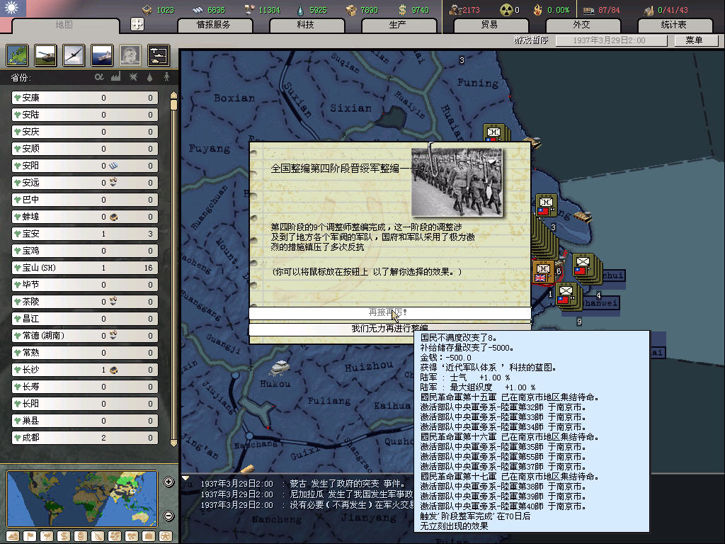 继续研究36步兵师的前置,不过如果是全国整编的话,意义不是很大,因为已经都是36师;中央整编的话,未整编的那些18师在本版本要消费大量的升级时间(约为造兵时间的1.5倍),仍然比较鸡肋,对早期抗日大局不会起很大作用。