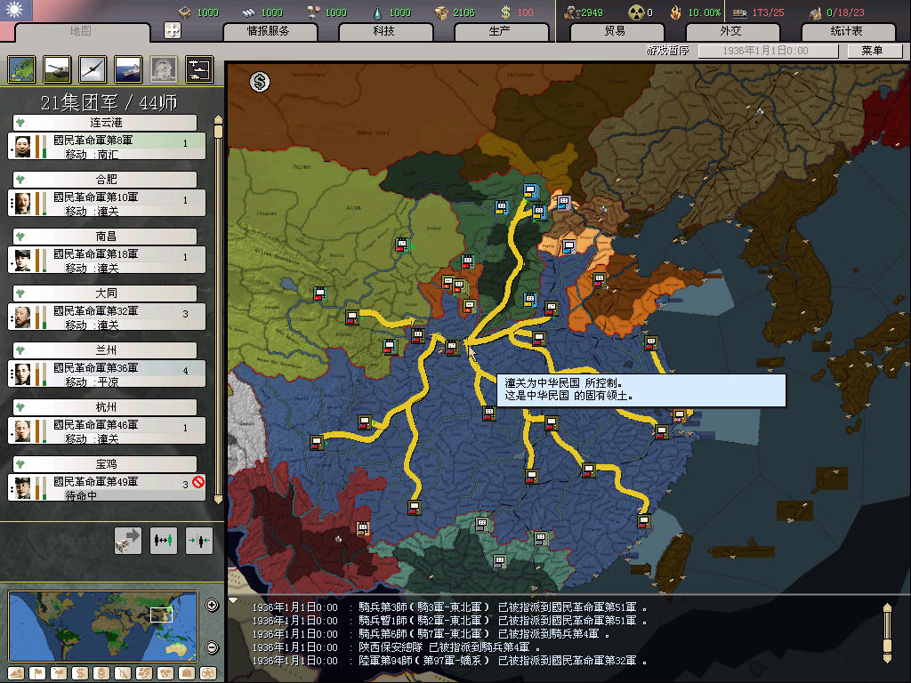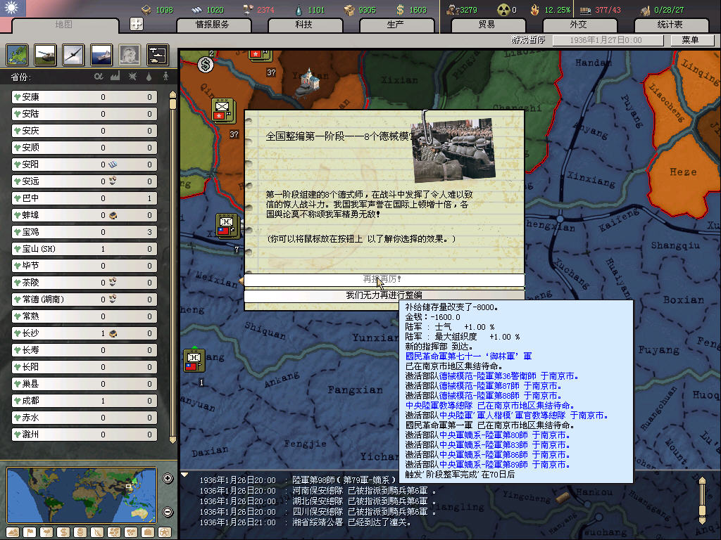 之前开过3.0的档,惨破。这次吸取教训,走精锐化暴兵路线。除了最开始因为全国整编造成兵力不足不得不造42个民兵师外,后面全造常备和标准,并慢慢裁掉民兵。这样人力也省下来了,造出的钱基本用不完。