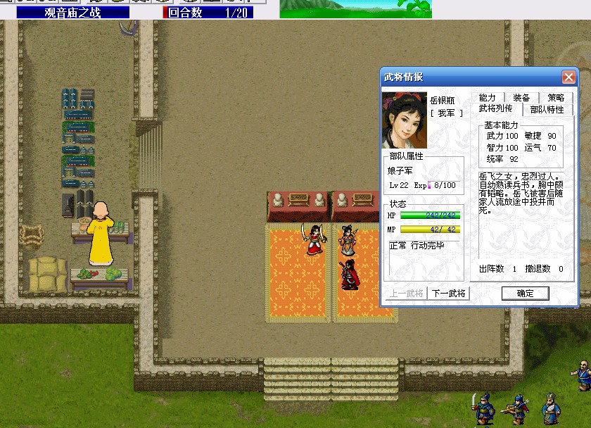 培养过程:西门、推屏风、出击、逃跑、分兵、救梁、坚守、奇袭、共同出战、打兀术、穿越金营、岳云VS花豹并胜出、绕到金营后面、攻粘罕岳云为先锋。特技:节12、精3、马2。需放弃青龙刀、轩辕春秋、赤兔马。这样的预计数值为100、92、100、92、66,我刷了5次,最终得如上美女!!!