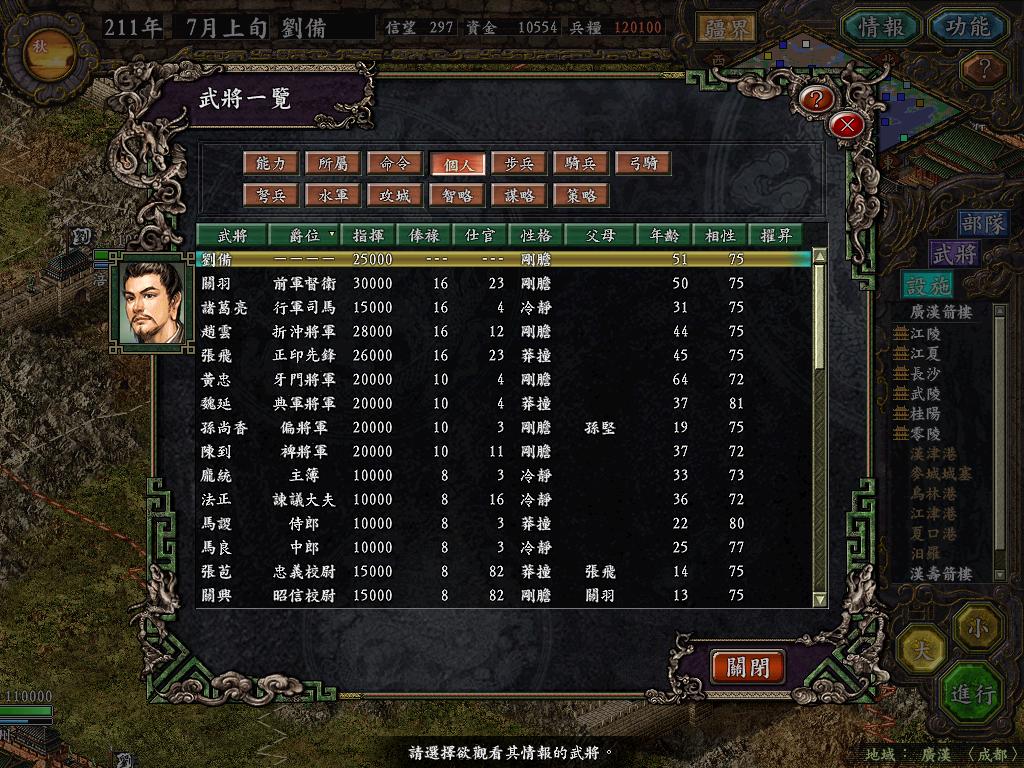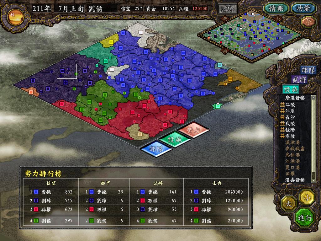 公元211年,汉中山靖王之后,宗室刘备,在继承了荆州刘表的政治遗产之后,面临了又一次险恶的局势。北面权臣曹操挟天子以令诸侯,200万大军实力天下第一。襄阳城更是有曹军31万,安南将军曹仁带领麾下34员大将虎视荆州。再看荆南四郡,虽然我军快攻抢在孙权之前取得了荆南四郡,但孙权麾下第一大将左将军周瑜并不甘心,带领16员大将20万大军驻扎在衡阳箭楼,相对应的我方在荆南只有2万人分布在四个城池之中。而此时的蜀地刘璋军,也对我军充满了恶意。