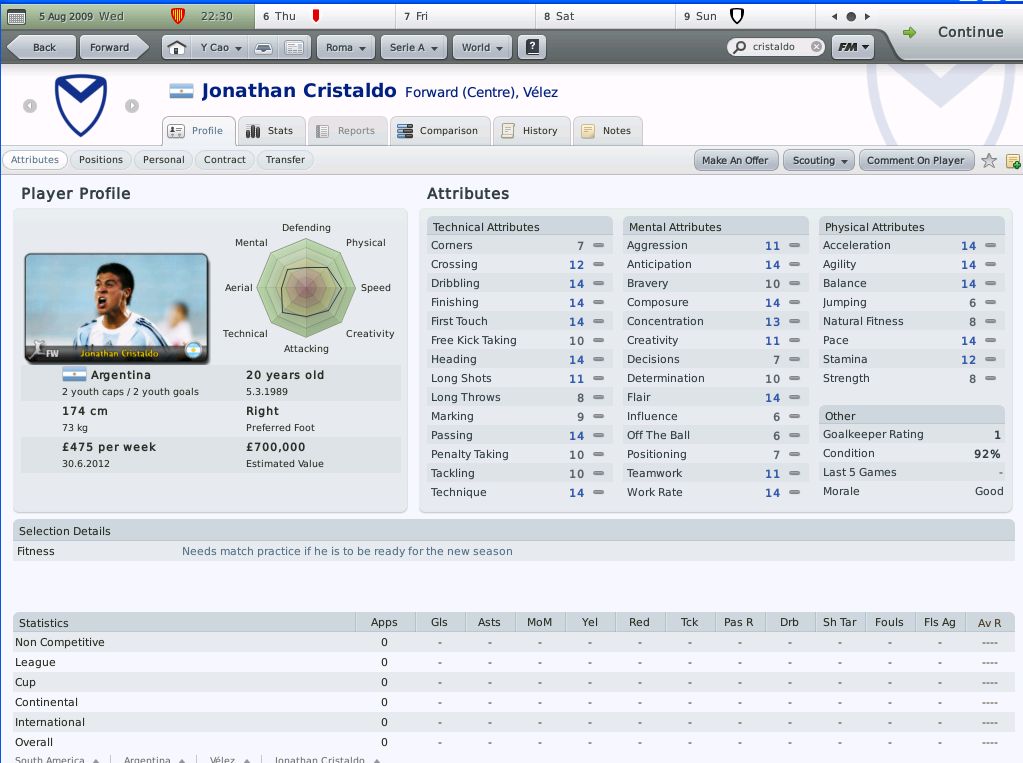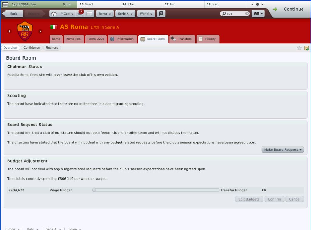 2009年7月14日,罗马俱乐部宣布,由于主教练Luciano Spalletti和俱乐部在人员购入方面存在很大的分歧,所以经过友好协商后俱乐部决定和其终止合同。而令人意外的是,虽然候选者有很多著名的主教练,但是罗马俱乐部主席Rossella Sensi出人意料的选择了毫无执教经验的我(^_^),作为球员的我还是经历辉煌的,现年仅仅29岁,曾经代表意大利国家队出赛33场并攻入9球。但是遗憾的是,在26岁的时候膝盖受到了一次重大的创伤,随后虽然经过多方诊治,始终无法恢复,不得不暂时离开了自己喜爱的球场。在过去的三年中,我完成了教练培训A级的考试,终于拥有了一个作为主教练的资格。令人吃惊的是,就在前几天我受到了罗马俱乐部的邀请,俱乐部给我一共了一份为期两年,周薪一万六千英镑的合同。作为一个完全的菜鸟教练来说,还是算一个不错的合同了。而且,作为罗马俱乐部的死忠,能够执教罗马也是我的梦想之一。同时我也知道,我现在毫无经验可言,来领这支在整个欧洲都享有盛誉的俱乐部,绝对是一个挑战。如果失败,就会很容易的把自己出于极其尴尬的地位,同时,也许可以毁灭我的整个教练生涯。但是我相信,有挑战才有高回报,所以我毅然决然的接受了俱乐部的邀请。