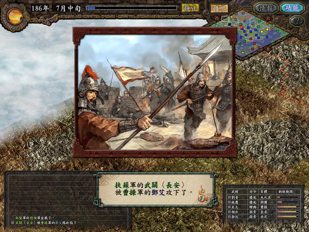 西羌果然出兵袭扰,但此时谍报传来一个坏消息:曹操向我军宣战——自身已四面树敌还要对我军下手,真是狂妄!只是我军大部兵力都在与西羌对垒,暂时无力东顾,只能再度送礼乞和了。秦王目送载着使者和一万粮草的车驾远去,转回身低语:“曹贼,他日自会与你作个了断!”。随后下令武关守军撤退,避免更大的损失,武关随即陷于曹操之手。