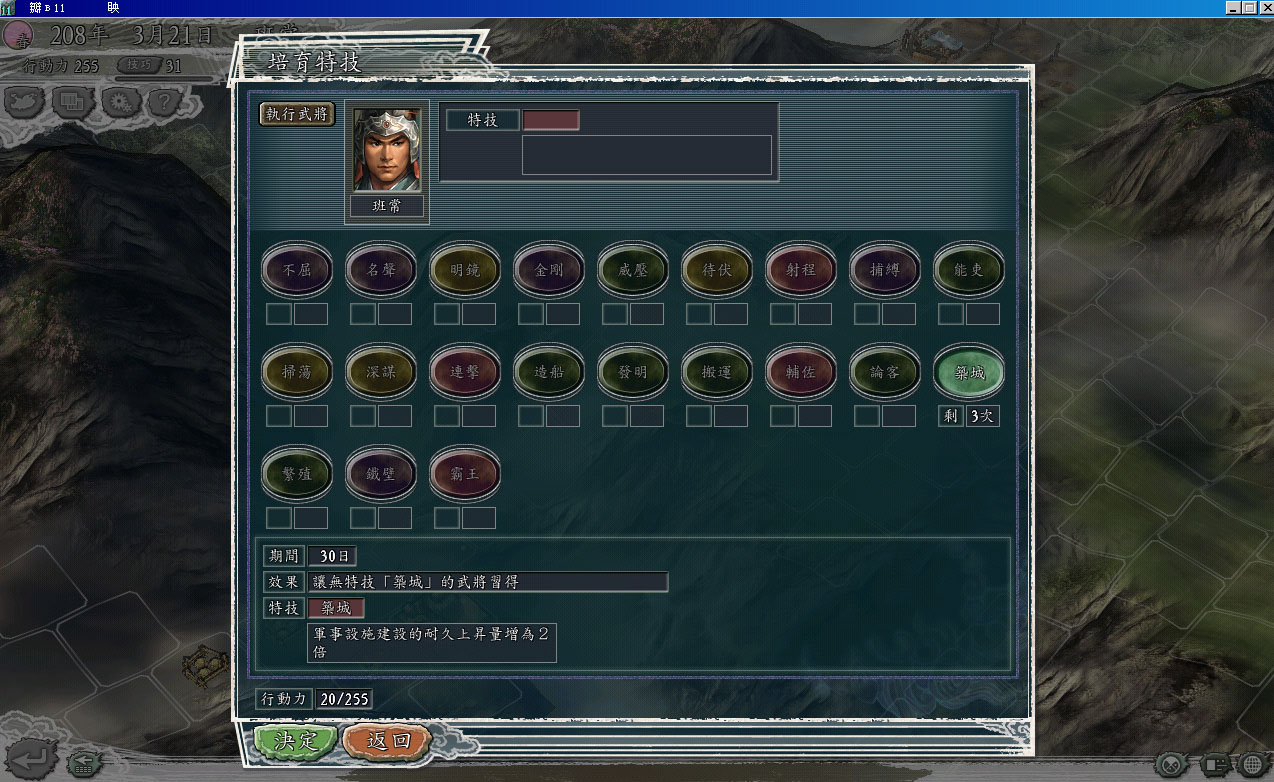 条件:自建武将,武力,智力,统帅,政治,魅力,均为1,技能为空白,各项属性均为C