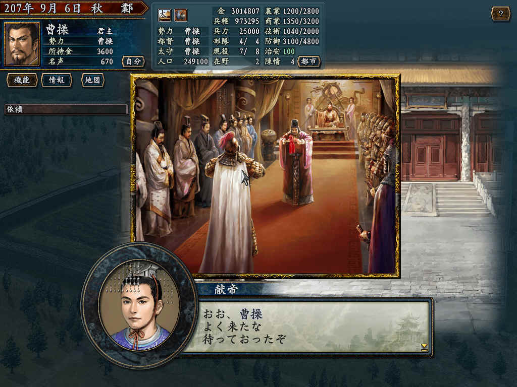 用207年剧本;发生袁尚被灭;程显计策使得老曹绑架徐庶老母;河北统一;获得官爵公!曹操必须首都在邺;城市规模为大;治安100;走进农地发生!
