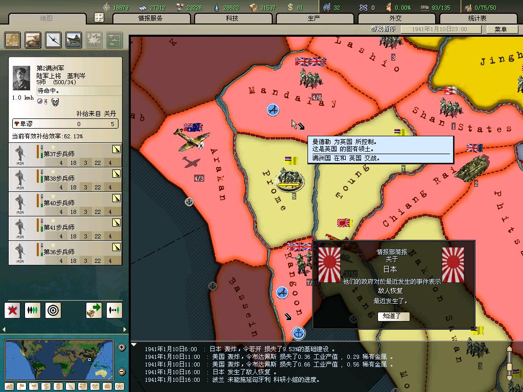 泰国战役胜利结束。纵观此次战役,由于没有合适的兵种,陆战学说还未成型,再加上英国人不断登陆马来半岛,需要分兵围剿,生产任务又非常紧张,人力和运力都达到了所能承受的极限,导致战事绵延大半年之久。加上泰国那糟糕的地形,整个战役非常郁闷,消耗太大了。。。