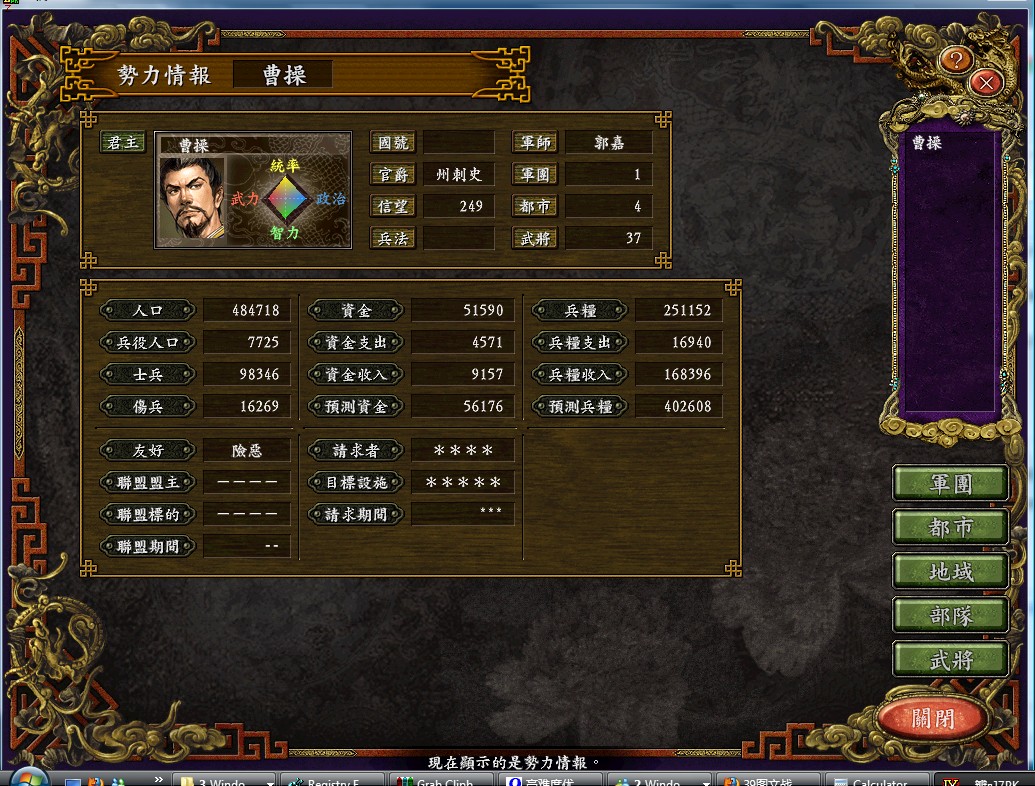 陈宫:恭喜温候入主陈留。曹操虽被压制在濮阳,但目前将领数是我军的三倍,士兵数是我军的两倍,钱粮无缺,想必他很快就要大举反扑陈留了,还请主公早做准备。
