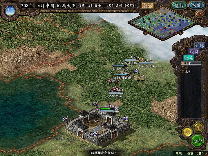 洗把脸,再来。这次我们不明着打北平了,剑锋一指,遥向寿春,汗,要一两百日后才能到。。。再来个中继点设在北平附近。可惜北平背山面水,一定要点攻击该城,无法用路过的方式把它打下来。不过在优化伴侣的帮助下,我军一出现在北平附近,其他城市就开始输送援军了,中继点战术部分失效。不过至少有效了一旬,只有在我军靠近北平以后,曹操才开始作出防御手段。对于兵多将少的乌丸国来说,延缓曹操一旬的援军还是很有用的。浩浩荡荡,6支弓骑队伍又出动了。