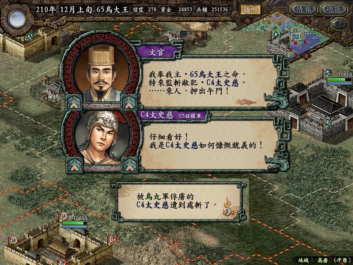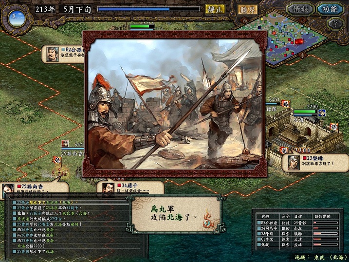 正忙碌着,4月开春了,曹丞相的大军又来了,张辽于禁也就罢了,司马懿也来了,咦,这家伙这么快已经出场了吗,再看看,郝昭都出兵了,天啊,他不是20年后跟诸葛亮对峙的人吗,怎么现在也已经是大将了,我晕。赶快赶快,再从襄平回救乌丸。虽然乌丸城有连弩兵法,但也禁不住司马懿他们的混乱攻势。一会儿“你们的粮仓已经没米了”,一会儿“投靠我军,分田分地”。乌丸城内诸将有心无力,又被曹操华丽的推倒了。。。
