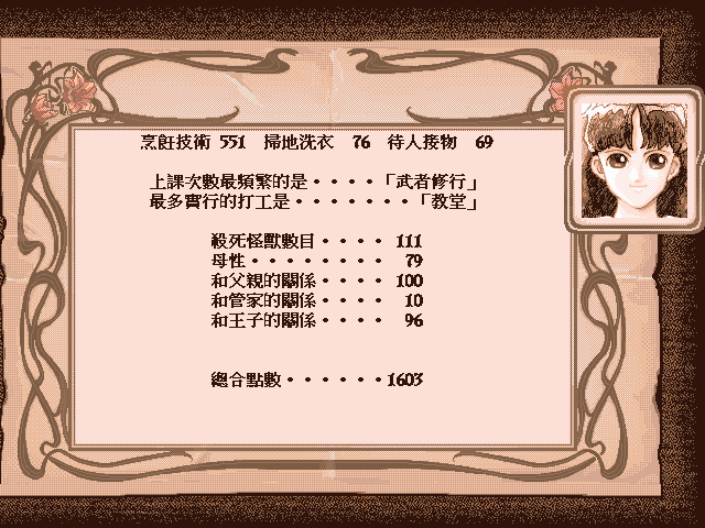 十四五岁以后一切都太轻松了,去教堂打工降罪孽加道德,降好了就做老师加道德加母性,由于做老师很累,教书两次后又可以去东部加烹饪技术,魅力降得多就去跳跳舞(反正体力和艺术表现这么高,魅力再怎么差也有200以上,那个死敌想赢饿?做梦),到后期又出现了失误,多做了两个月无谓的事(过分关注智力),魅力未上500,比较遗憾,不过不影响优秀女王的结果。