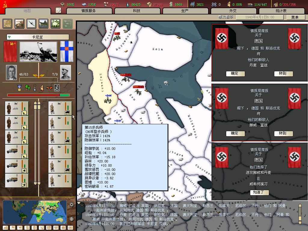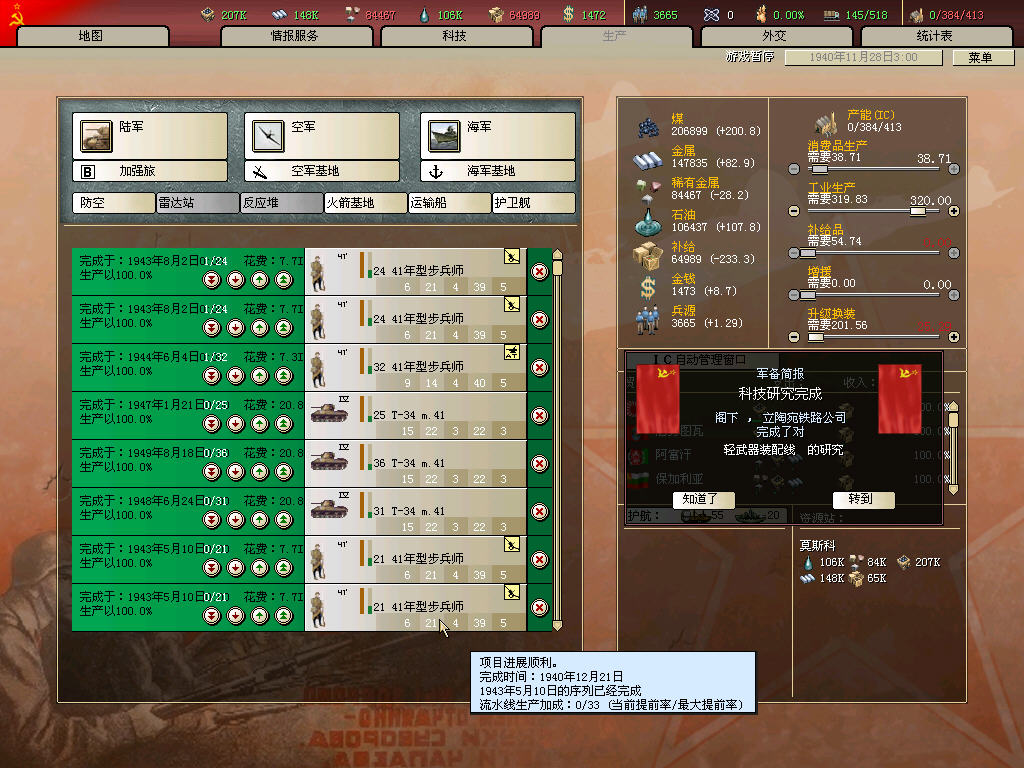 车辆装配.41坦克.轻武装配先后完成,步兵流水已增至25条,除6条反坦,其余一律配属野战炮(考虑到科技.人力.IC,特种师扩充计划被无限期雪藏)