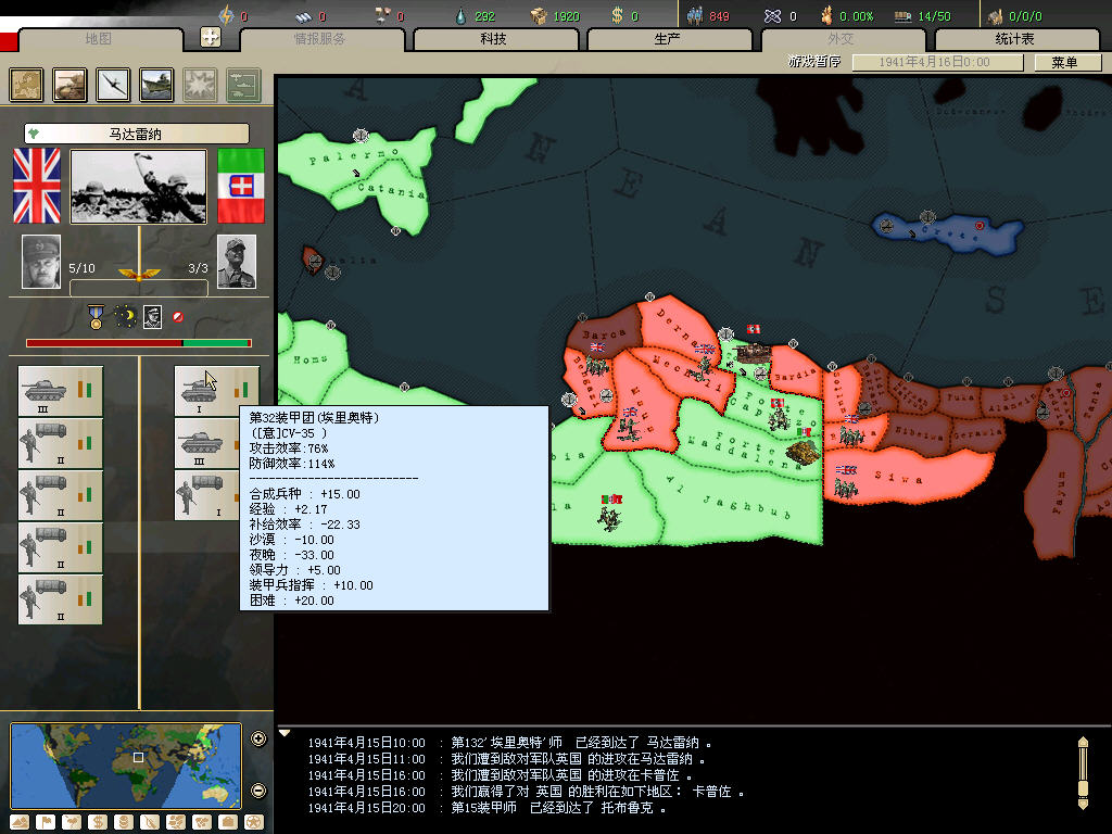 同样的北非战场,我80几个精锐师,还没加事件刷的,被英军赶下海3次。。。。。。